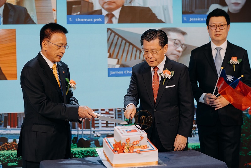 梁代表與僑務委員張嘉升(左1)一齊切國慶生日蛋糕。