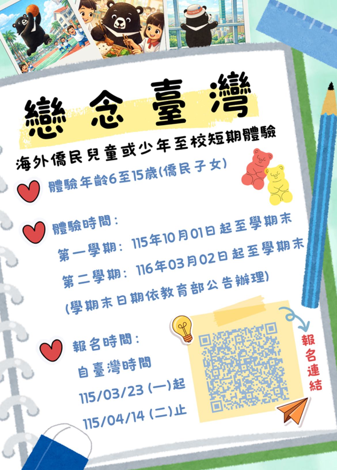 115學年度戀念臺灣-海外僑民兒童或少年至校短期體驗計畫自3月23日至4月14日開放報名