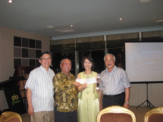 Representative Vanessa Shih and Deputy Representative Jeremy Liang(first from left)accept donations for Typhoon Morakot disaster relief from Formosa Club members Mr. Y.F. Chiang (first from right) and Mr. S.P. Kao(second from left).