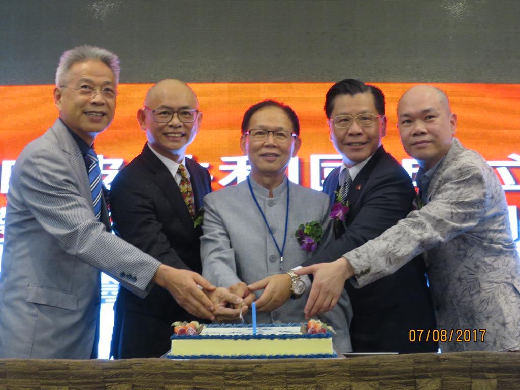 Representative Liang (second from right), Mr. Cham Seng Ying (center), President of the United Chinese Library, Mr. Toh Soon Huat, BBM, Chairman of the Sian Chay Medical Institution (second from left), and other VIP guests at the cake-cutting ceremony to celebrate Singapore’s 52 years of independence.