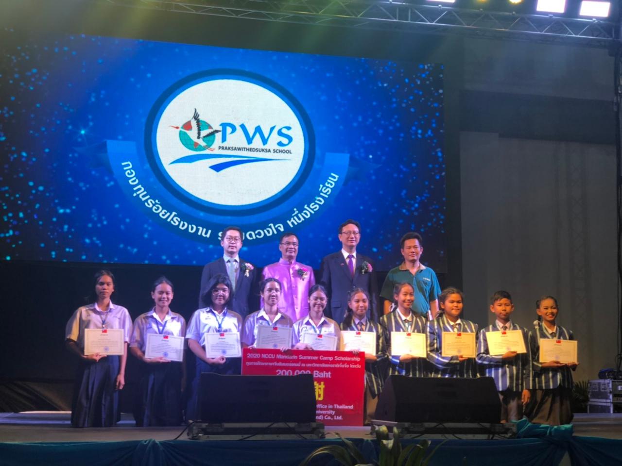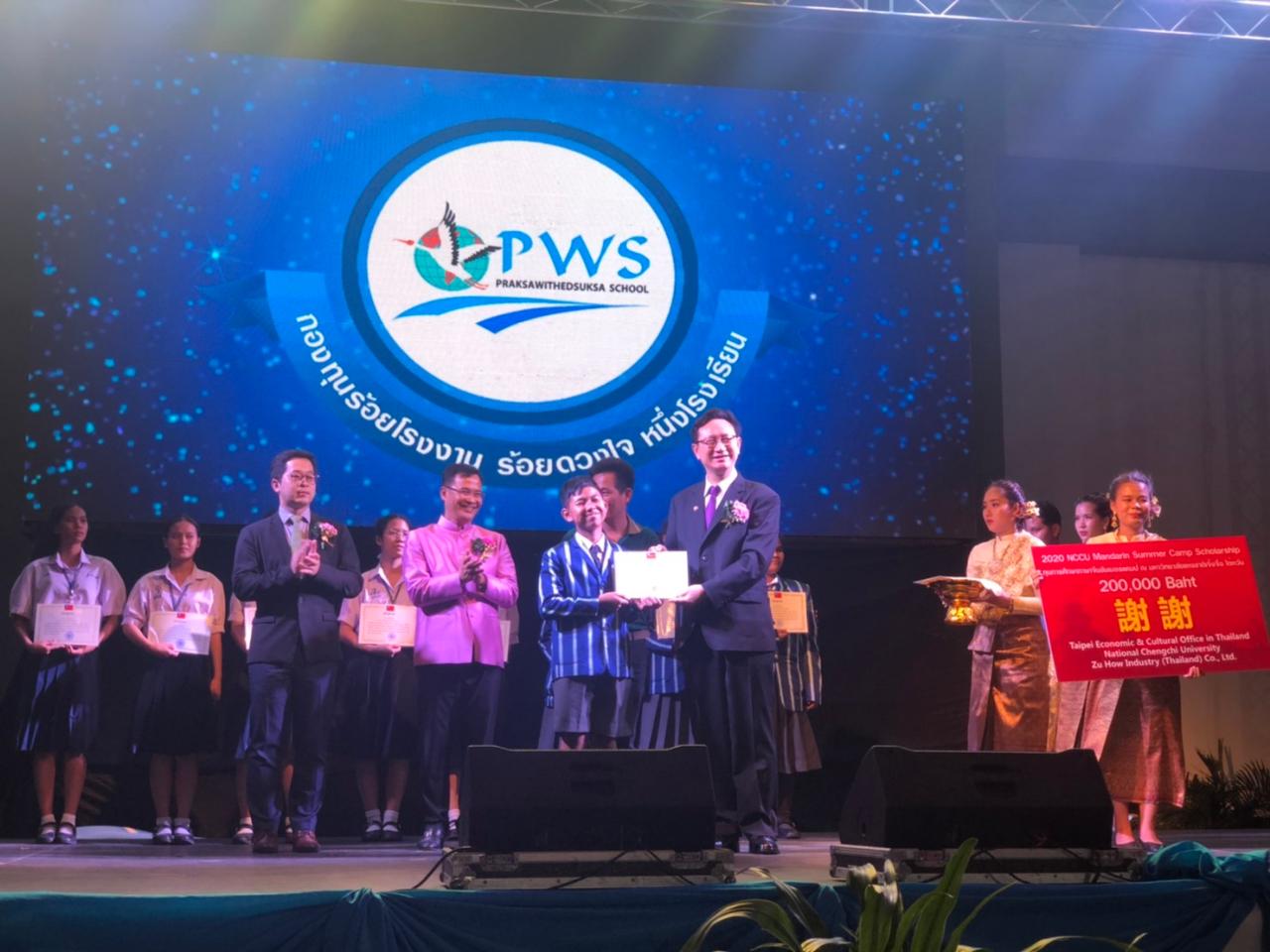 北欖府Praksa Withedsuksa School(PWS)中學於2月14日歡慶建校8週年,駐泰國台北經濟文化辦事處偕同我國立政治大學代表及志豪工業有限公司代表,本著積極推動臺泰教育合作之理念,出席PWS中學校慶活動,志豪鍋爐公司贊助20萬泰銖獎學金,由童大使頒發奬學金給該校10名優秀學子,同時由國立政治大學免費提供語言課程,讓他們能在今年暑假前往國立政治大學就讀華語班,將臺泰教育交流的未來向下紮根。