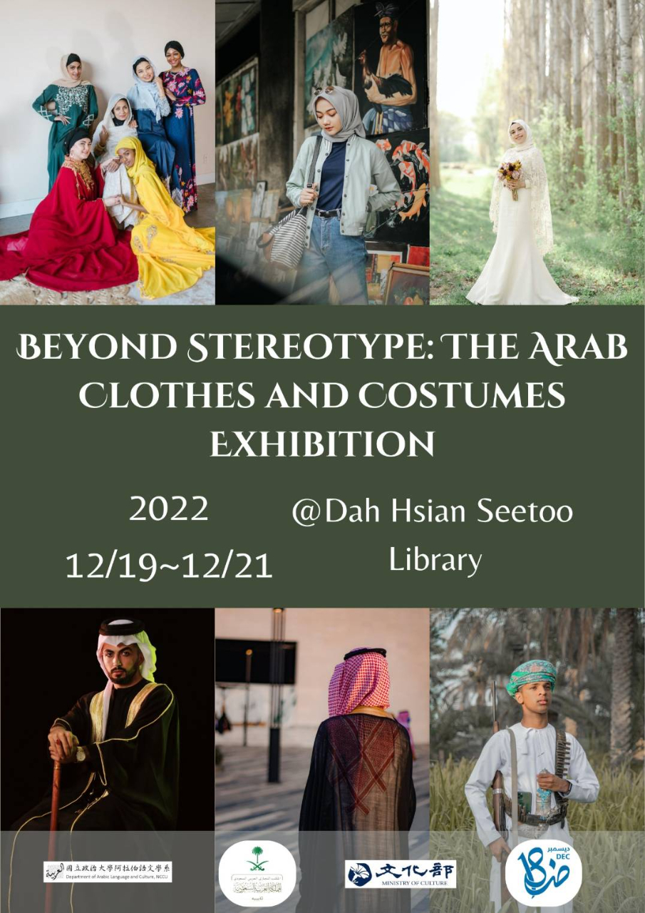 在臺灣約有20萬能讀阿拉伯語的人口,而為紀念與推廣每年12月18日國際阿拉伯語日,並增進對於阿拉伯國家多元文化的交流與尊重,文化部與國立政治大學阿拉伯語學系等單位合作辦理《超越刻版印象:阿拉伯服裝特展》,期待透過服裝的展示搭配相關說明,增加大眾對阿拉伯服飾的了解。此外,作為數位人文的實踐,海報也印上QR code,連結到阿拉伯歷史、文化等延伸閱讀資料,讓參觀者可以更進一步探討了解感興趣的議題。