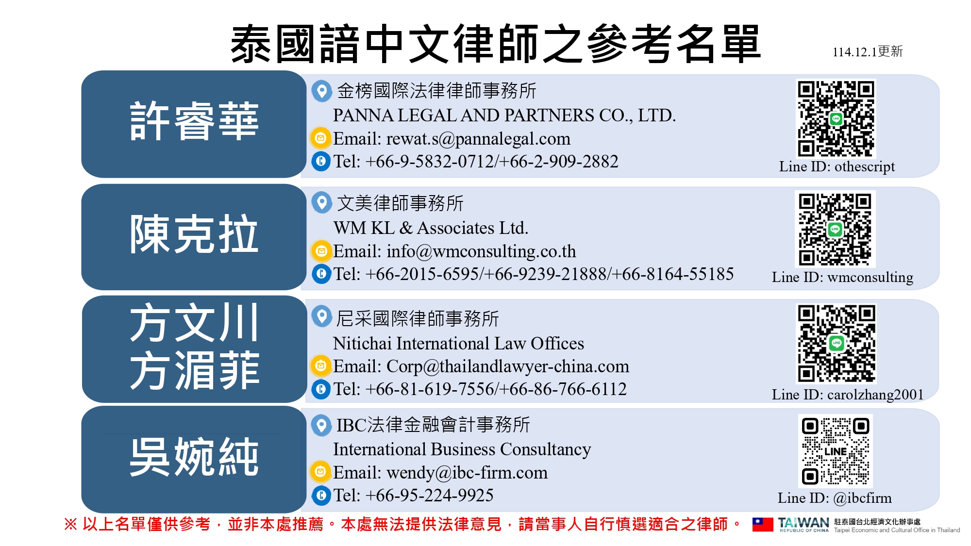 泰國通中文之律師名單僅供參考,並非本處推薦,代表處無法提供法律意見,請當事人自行慎選適合之律師。