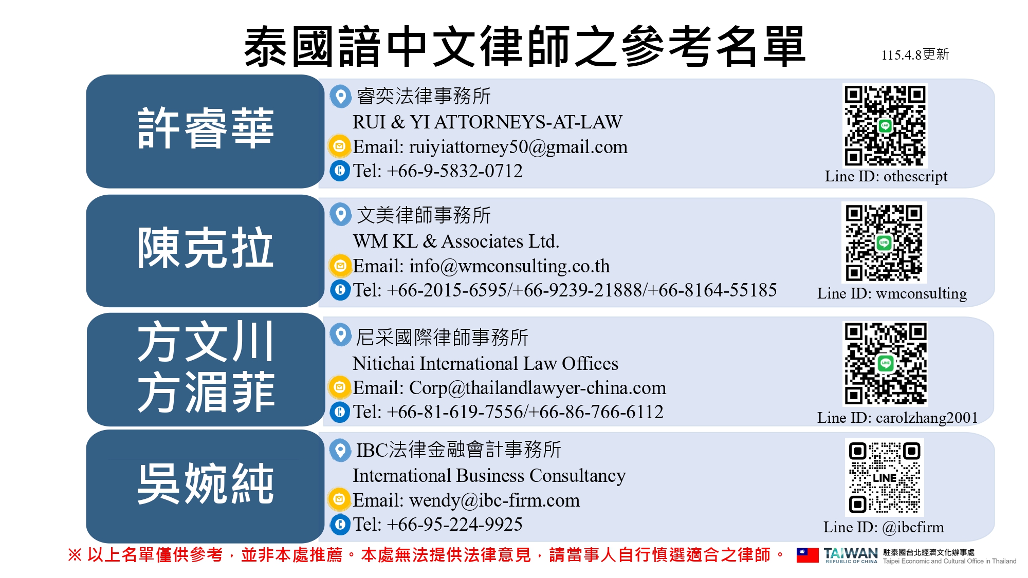 駐泰國代表處參考律師名單(2026年4月更新) (PDF檔案)