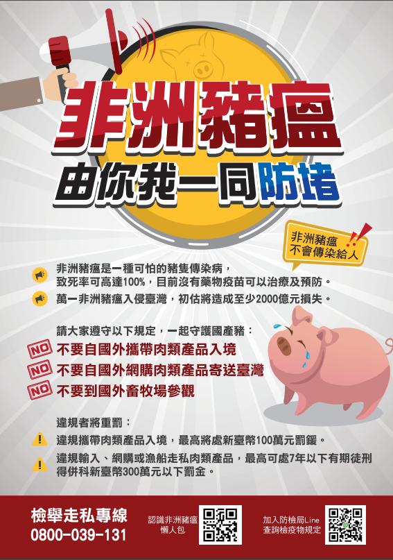 禁止攜帶肉類及其製品入境,如攜帶非洲豬瘟疫區(如中國)豬肉及其製品入台,最高可處新台幣100萬元罰鍰。