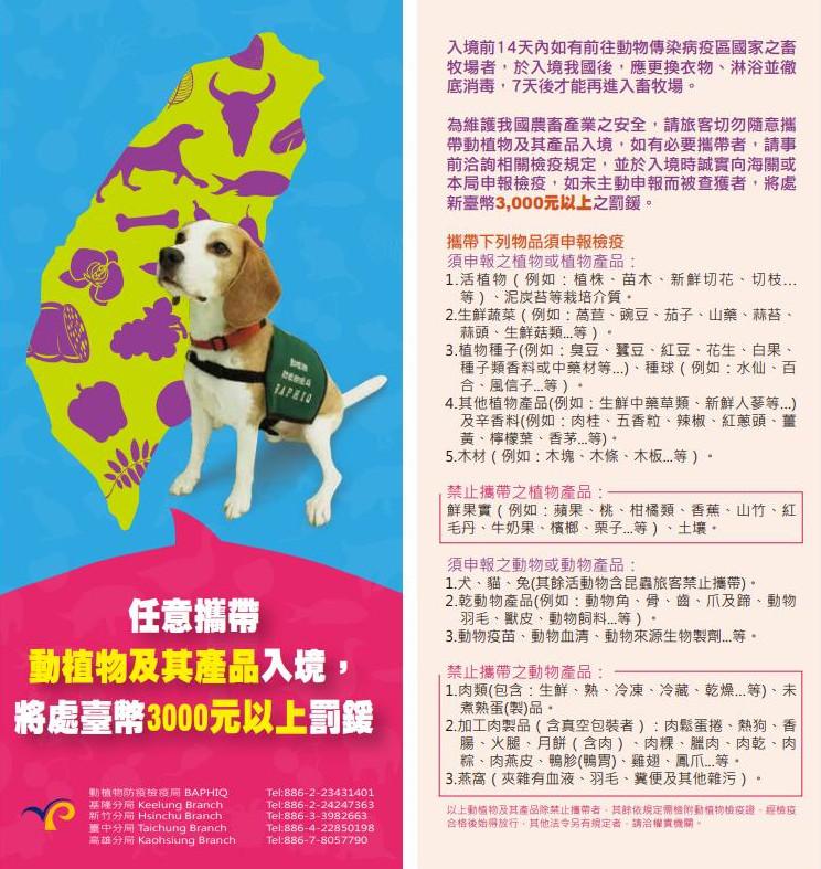 為保護我國農畜產業安全,赴台旅客請勿隨意攜帶動植物及其製品入台,如有必要攜帶者,應事前洽詢相關檢疫規定,並於入境時向海關或動植物檢疫局申報,如有違反規定者處新台幣三千元以上罰緩。