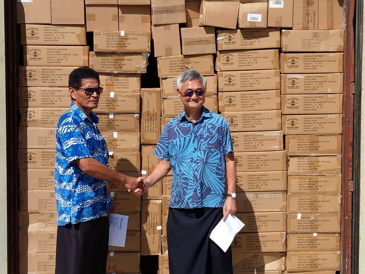 10月29日本館蘇大使仁崇代表「幫幫忙基金會」捐贈吐瓦魯愛心物資貨櫃,吐國則由地方政府部部長羅歐依(Katepu Laoi)代表吐國政府及人民接受。