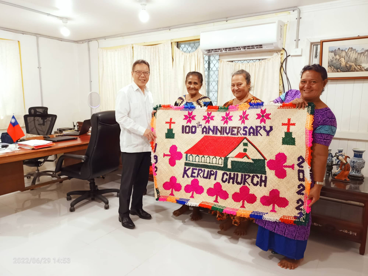 After joining the celebration of the 100th Anniversary of the Kerupi church in Nui this May, Ambassador is happy to see Secretary of Nui Island Kupule, Taom Tanukale, and members of women community visiting Taiwan Embassy.