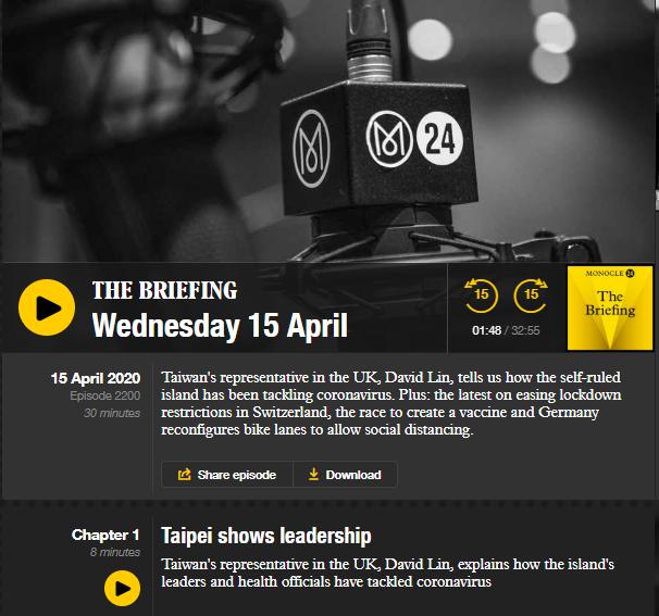 英國Monocle雜誌所屬電台Monocle 24的每日重點新聞報導節目15日播出「台北展現領導力」(Taipei Shows Leadership)專訪內容。