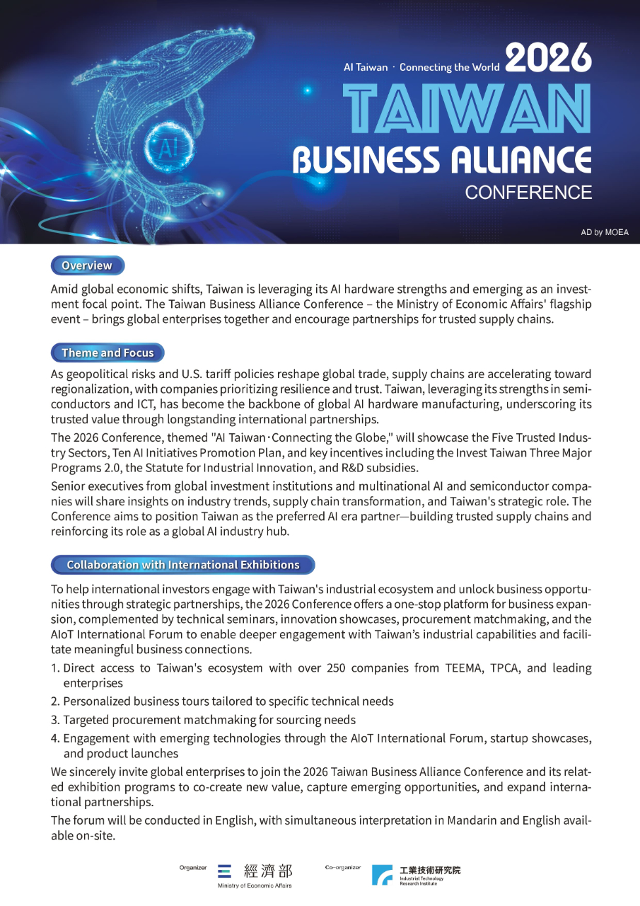 The 2026 Conference, themed "AI Taiwan.Connecting the Globe," will showcase the Five Trusted Industry Sectors, Ten AI Initiatives Promotion Plan, and key incentives including the Invest Taiwan Three Major Programs 2.0, the Statute for Industrial Innovation, and R&D subsidies.
