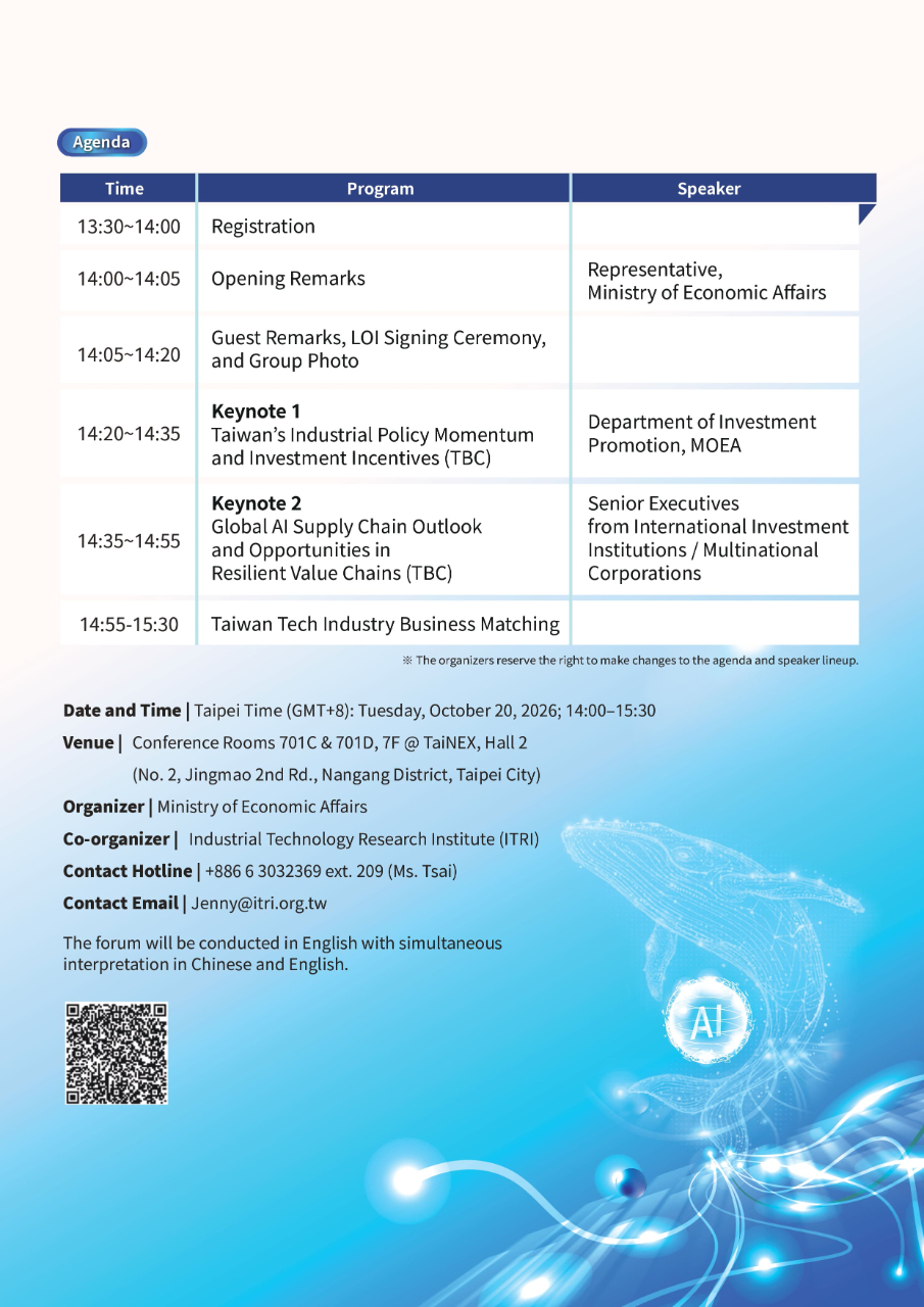 Senior executives from global investment institutions and multinational AI and semiconductor companies will share insights on industry trends, supply chain transformation, and Taiwan's strategic role. The Conference aims to position Taiwan as the preferred AI era partner—building trusted supply chains and reinforcing its role as a global AI industry hub.