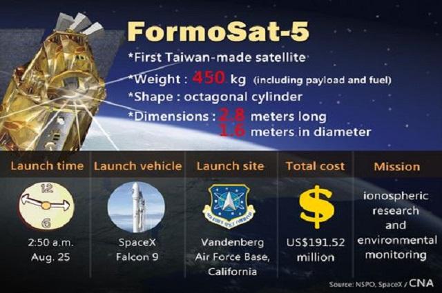 On 25 August, Taiwan’s first domestically developed remote sensing satellite, FORMOSAT- 5, launched at Vandenberg Air Force Base in California.