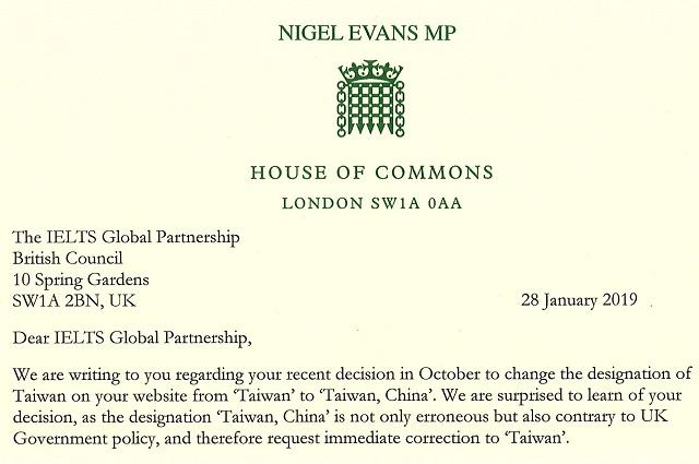 The parliamentarians pointed out that the decision follows pressure from China and is based on commercial interest, adding that “although IETLS is a private enterprise, it should not have the terms of its business dictated by a foreign government.” The letter stated that IELTS succumbing to this political pressure undermines the UK’s democratic principles and harms the free operations of international business. Citing growing educational relations between the UK and Taiwan, the parliamentarians concluded by calling on IELTS to reconsider its decision and amend its website to the previous and proper designation of simply “Taiwan”, which may well allow the UK to continue increasing its educational exchanges with Taiwan.