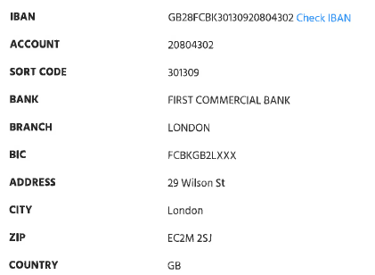 IBAN : GB28FCBK30130920804302 / SORT CORDE: 301309