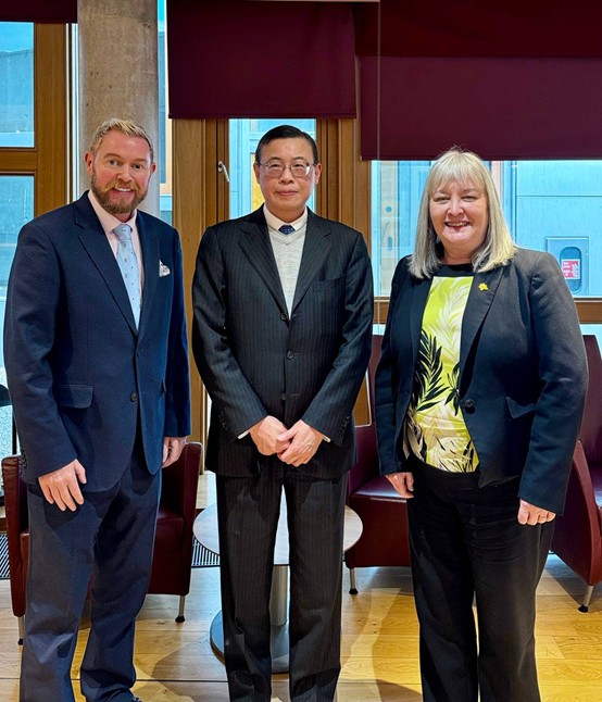 丁總領事志華與蘇格蘭議會友台小組共同主席Rhoda Grant及Jamie Greene餐敘,感謝他們從2021年擔任蘇格蘭議會友台小組共同主席至今對台灣的支持與友誼。