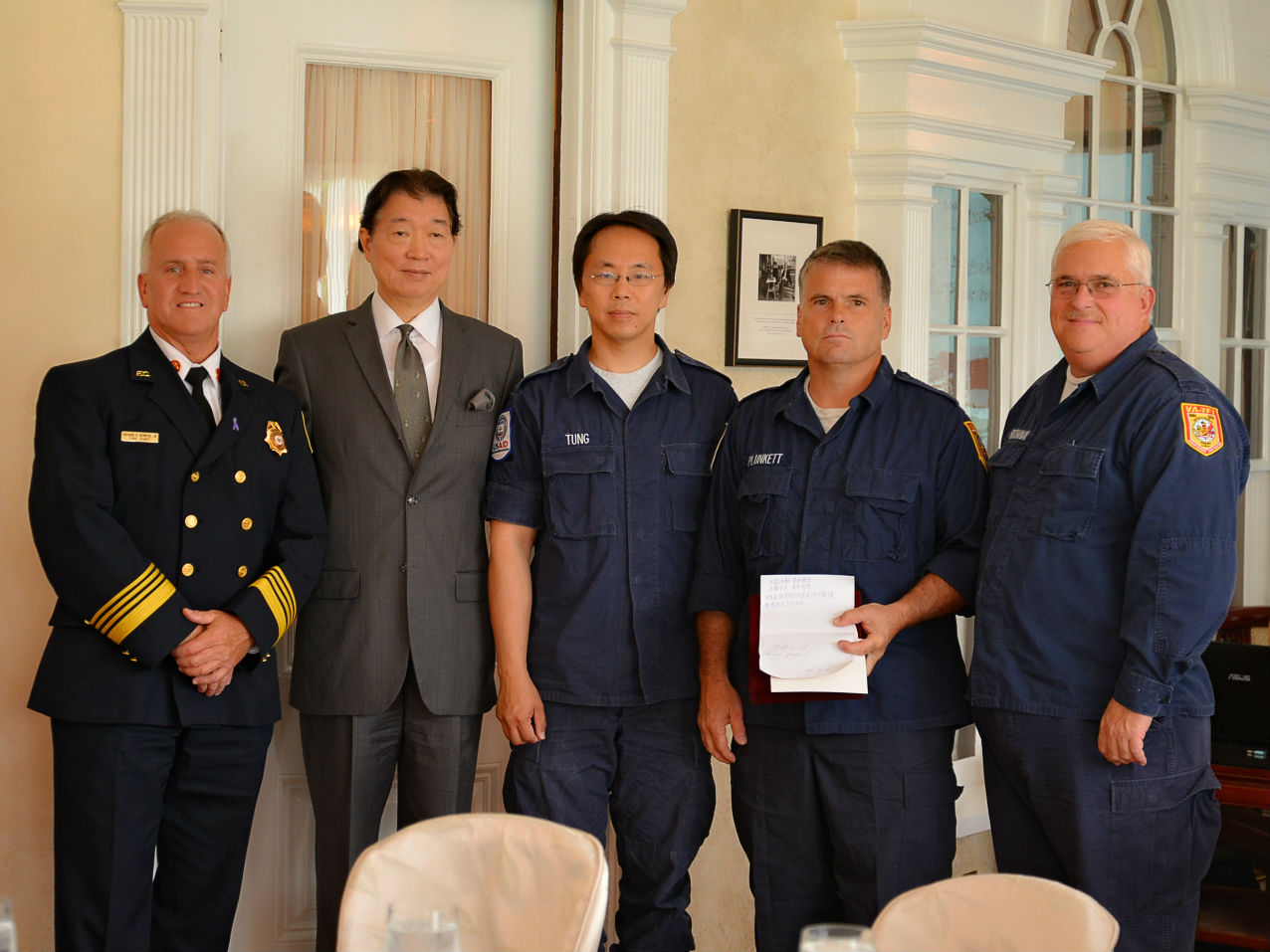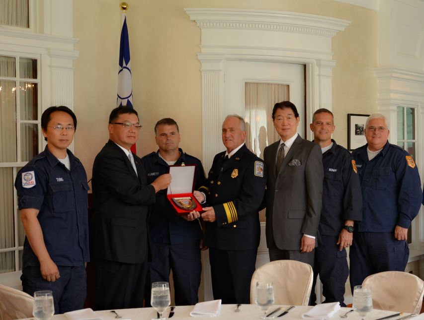 - 沈大使與費郡消防局局長鮑爾斯(Richard Bowers)及3名曾參與1999年「九二一」震災搜救工作之費郡搜救隊人員
