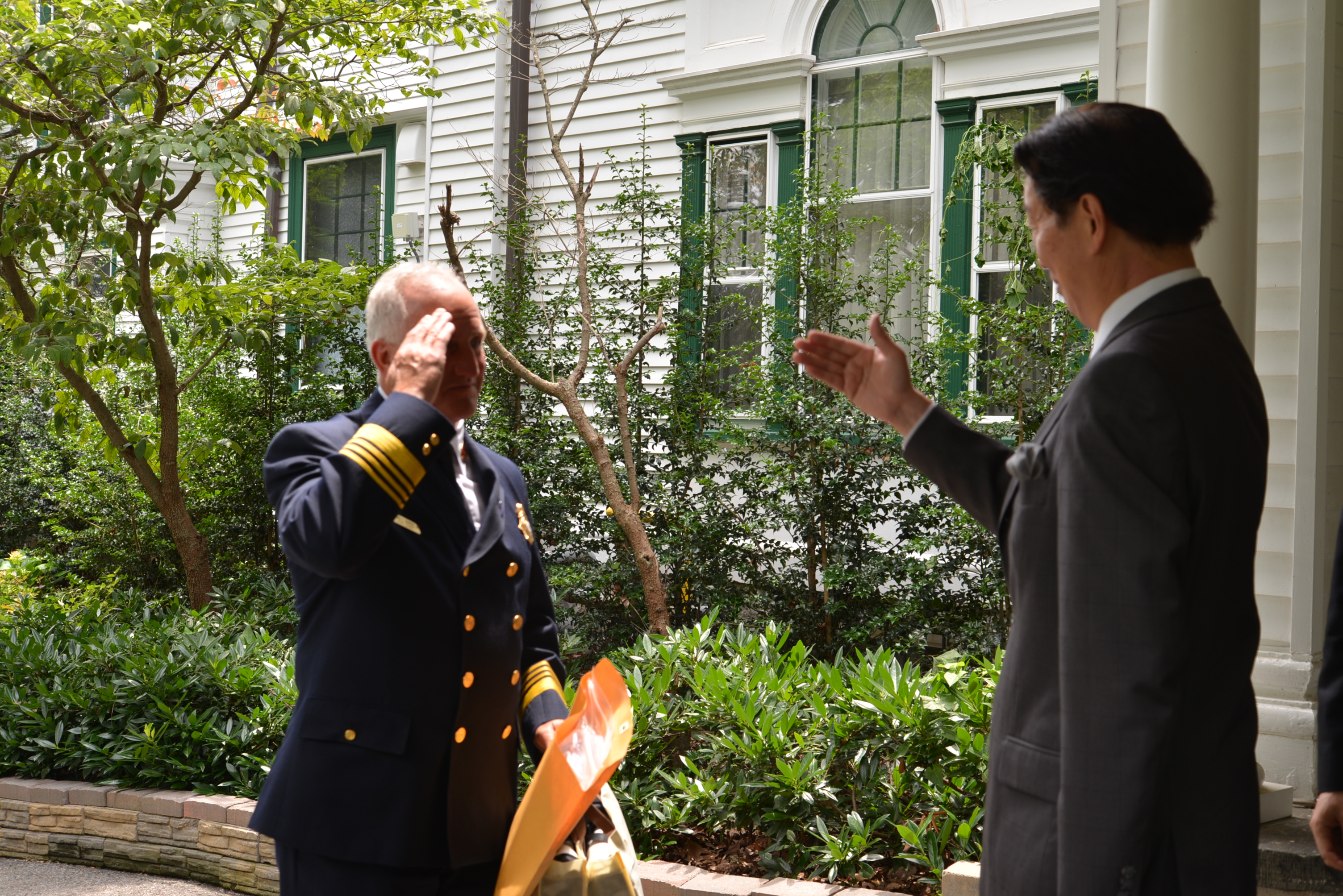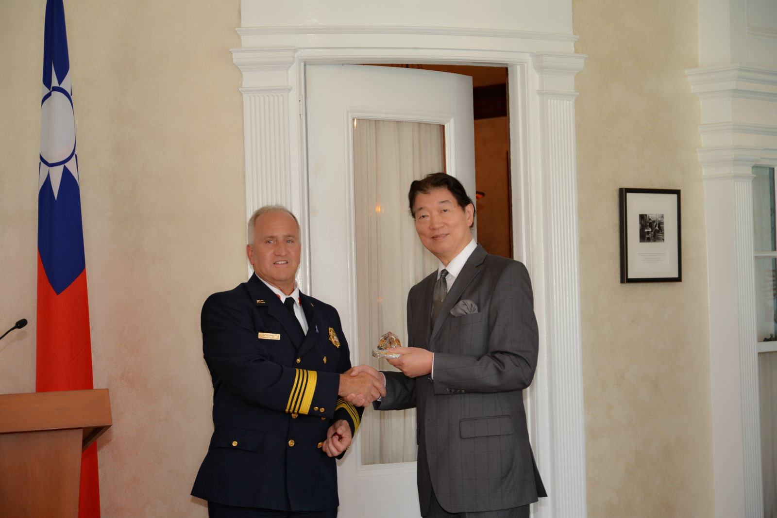 - 費郡消防局局長鮑爾斯於離開餐會時向沈大使行禮致意。