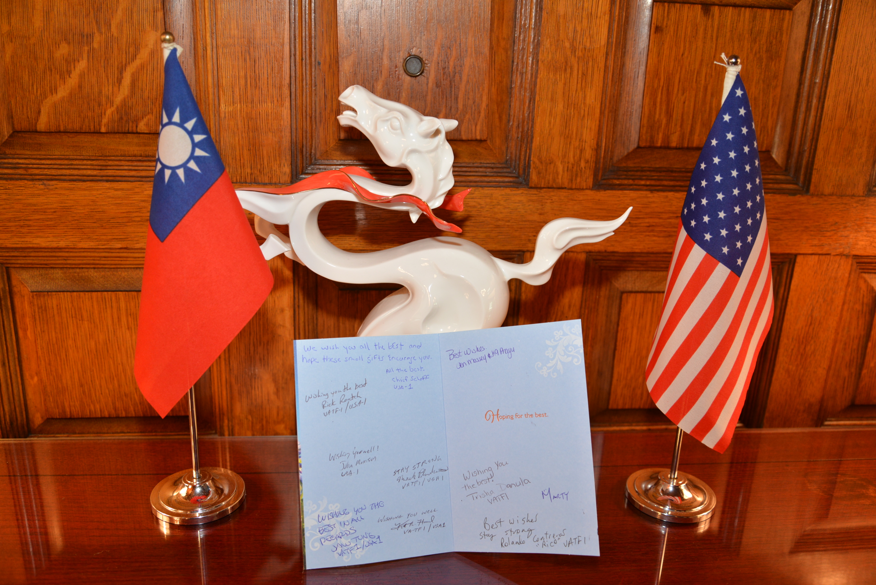 16年前由費郡搜救隊所救出的國人許先生特別手寫感謝卡,表達對該搜救隊的感激之情,由沈大使宣讀翻譯轉致;費郡搜救隊隊長薛夫(Chris Schaff)亦將該隊所有隊員簽名的致意卡及紀念品回贈許先生,請我方轉致,場面溫馨感人。沈大使並特以臺灣新開發的環保回收產品,用咖啡渣作成的涼快T恤及保特瓶回收作成的攜行袋,與我紀念幣等送給美方友人,也贏得一致的驚喜與對臺灣環保科技的讚許。