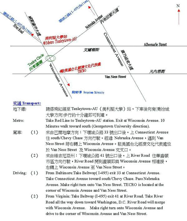 電話:(1-202) 895-1800(20Lines) 傳真:(1-202) 3630999 緊急聯絡電話:(1-202) 669-0180,專供急難求助之用,倘非關急難事件,請勿撥打;一般領務事項,請於上班時間撥打辦公室電話查詢。