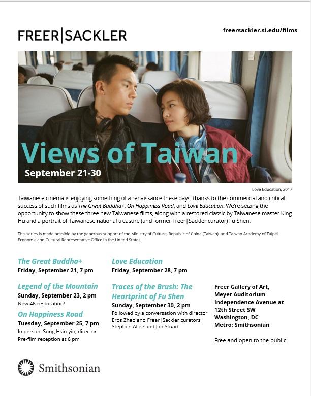 華府「富麗爾博物館」(Freer and Sackler Galleries)自本(2018)921日起至930日推出「臺灣電影特映會」(Views of Taiwan)放映《大佛普拉斯》(The Great Buddha +)、《山中傳奇》(Legend of the Mountain) 4K數位修復版、動畫片《幸福路上》(On Happiness Road)、《相親相愛》(Love Education)及《傅申-筆墨究心(Traces of the BrushThe Heartprint of Fu Sheng) 5部精選臺灣當代及經典影片,呈現臺灣電影創作與動能。特映會免費入場,播映時間地點等詳情請參考:https://www.freersackler.si.edu/events/films