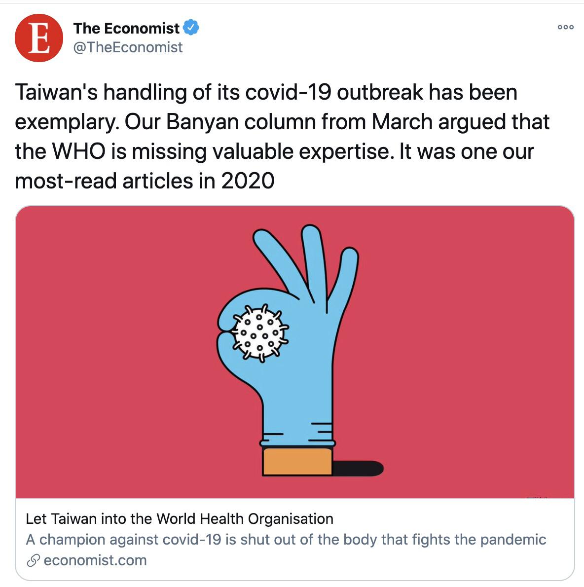 英國「 經濟學人」雜誌在本三月以「台灣應被納入世界衛生組織」為題的專欄,是該雜誌2020年最受歡迎的文章之一。本篇文章特別指出,「台灣模式」可以提供聯合國世界衛生組在新冠肺炎的專業知識,並展現「 台灣能幫忙」的精神。