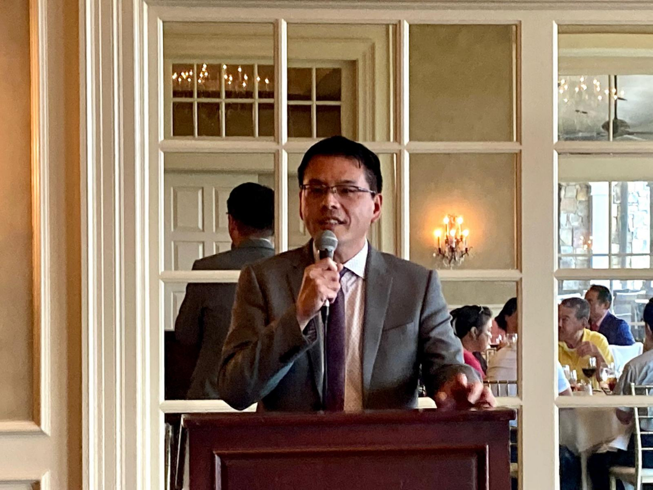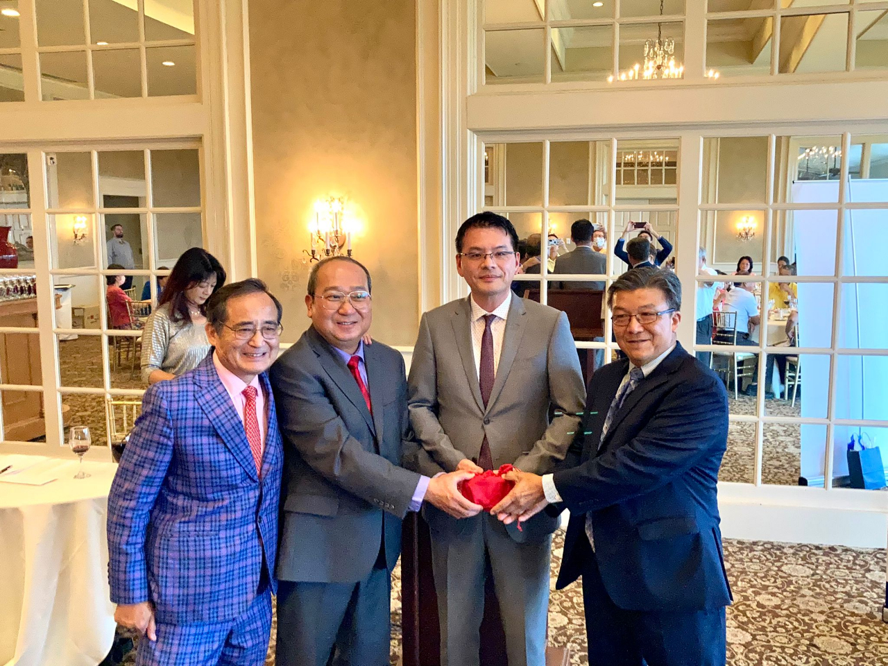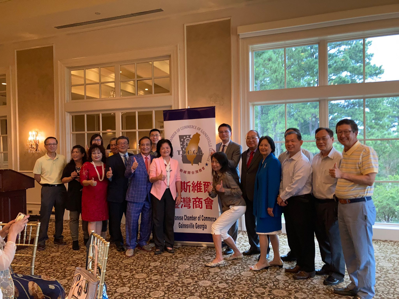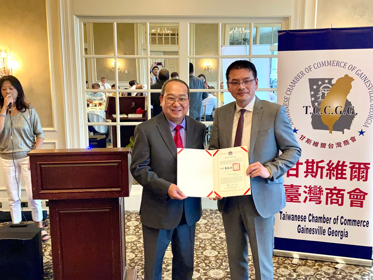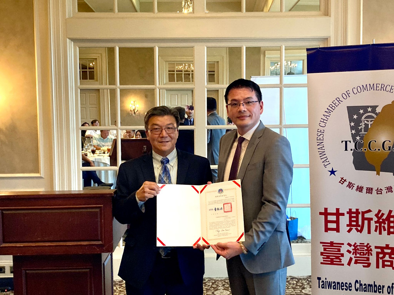 駐亞特蘭大辦事處王處長出席甘斯維爾台灣商會新舊任交接典禮,他感謝汪會長任內與本處積極合作,交接典禮由王處長協助監交並頒予新任會長證書,並祝福新任谷會長及其幹部上任順利,持續發揚台灣在喬州影響力。