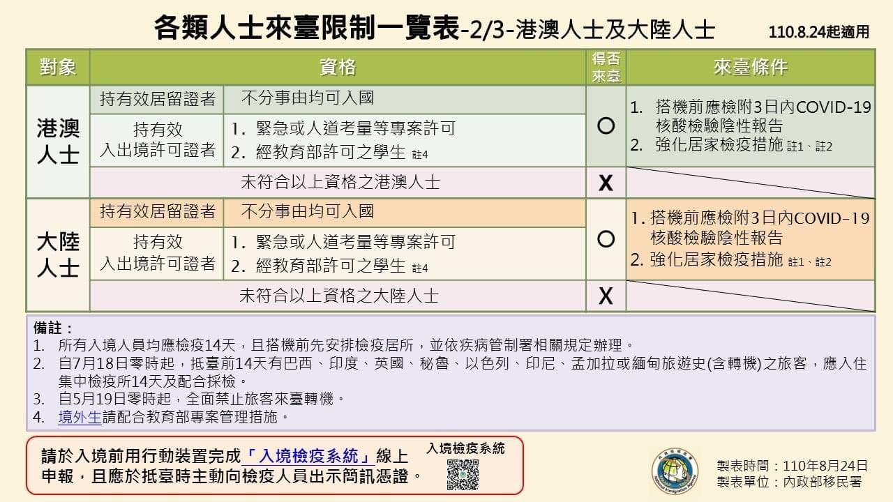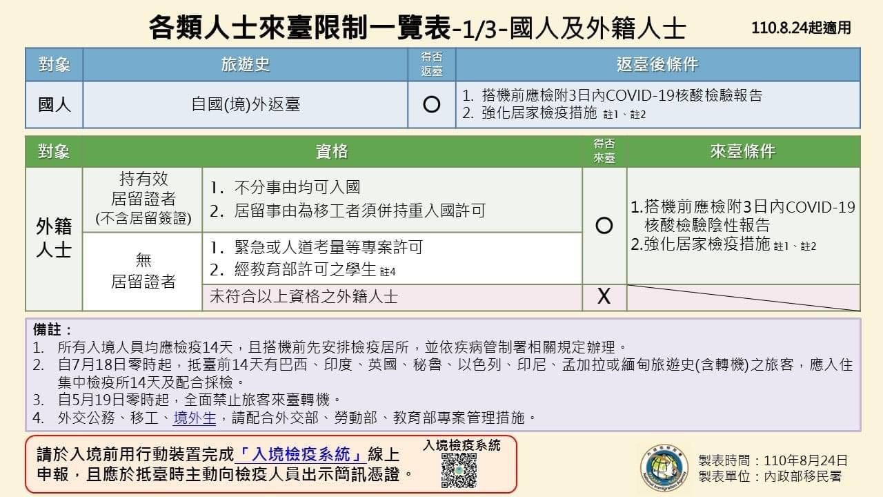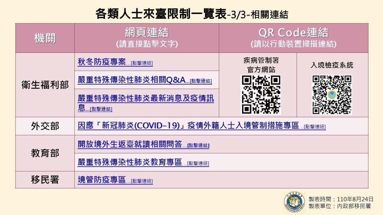 內政部移民署110年8月24日公布最新各類人士來臺限制一覽表,三張圖表標示「國人及外籍人士」、「港澳及大陸人士」,以及「相關連結」。點選「相關連結」圖表可至衛服部、外交部、教育部,及移民署網站瞭解最新規定。