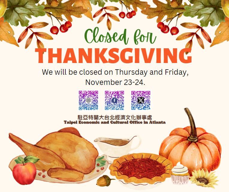駐亞特蘭大台北經濟文化辦事處配合美國感恩節國定假日,將於2023年11月23-24日(星期四、五)暫停對外服務。倘於前述假日遇有重大急難事件需緊急協助,請撥打本處緊急聯絡電話: 404-358-3875。