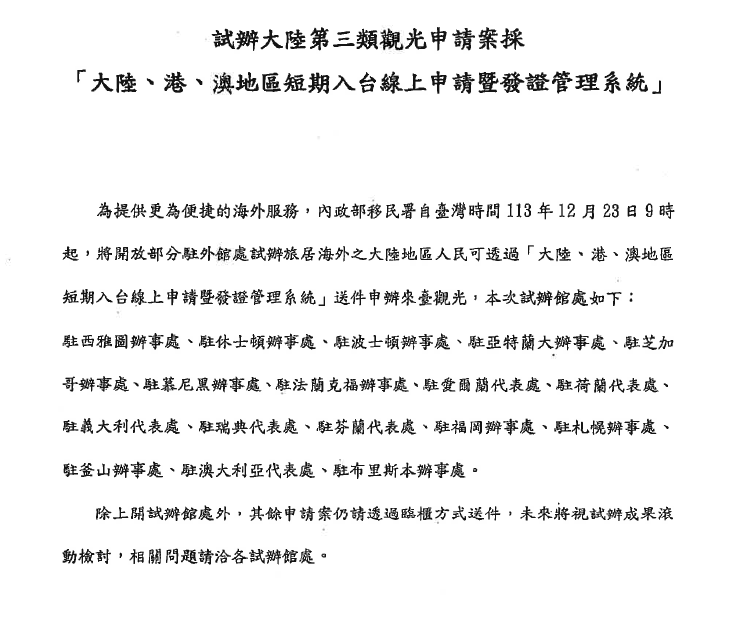 試辦大陸第三類觀光申請案採「大陸、港、澳地區短期入台線上申請暨發證管理系統」