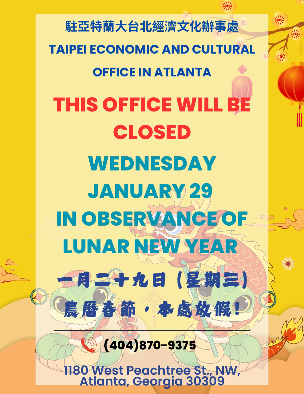 駐亞特蘭大台北經濟文化辦事處慶祝農曆新年正月初一,將於2025年1月29日(星期三)暫停對外服務乙日。倘於前述假日遇有重大急難事件需緊急協助,請撥打本處緊急聯絡電話: 404-358-3875。