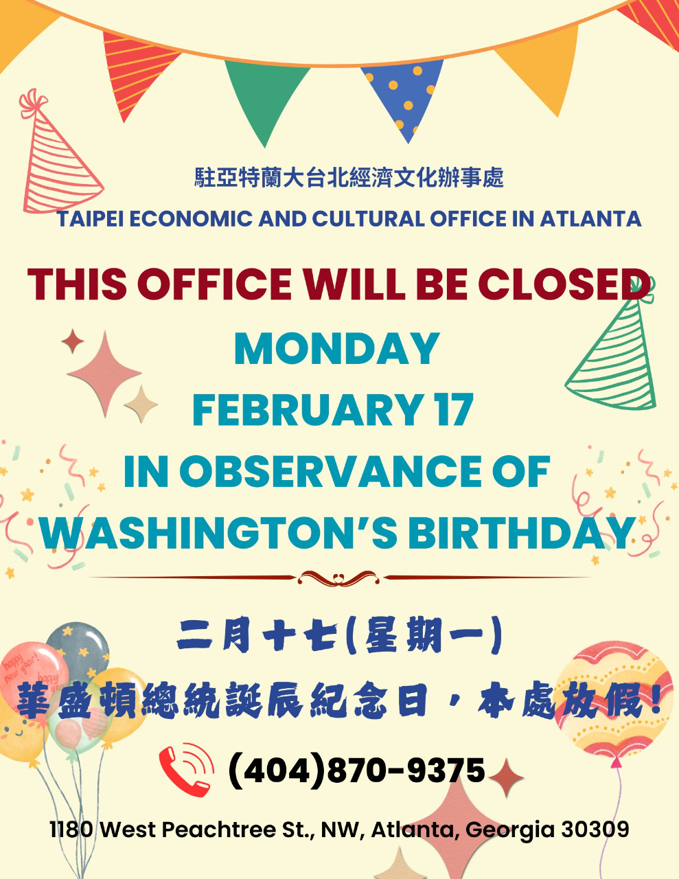 駐亞特蘭大台北經濟文化辦事處配合美國華盛頓總統誕辰紀念日國定假日,將於2025年2月17日(星期一)暫停對外服務乙日。倘於前述假日遇有重大急難事件需緊急協助,請撥打本處緊急聯絡電話: 404-358-3875。