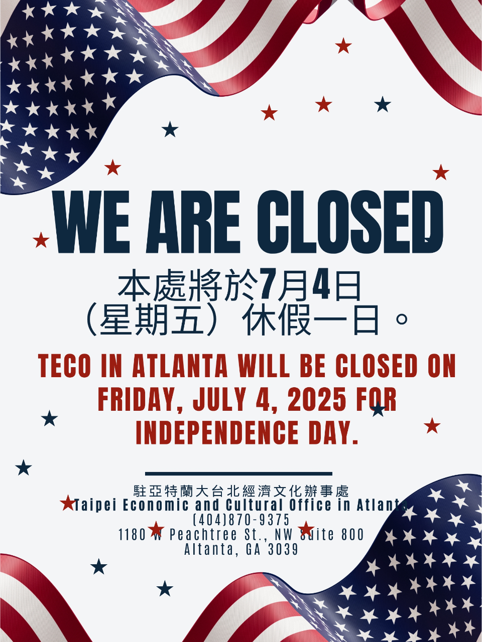 2025年7月4日(週五)美國獨立紀念日,本處比照美國聯邦政府機構放假一天,當日領務櫃台亦將暫停服務。如遇緊急狀況需本處協助,請電(404) 358-3875。