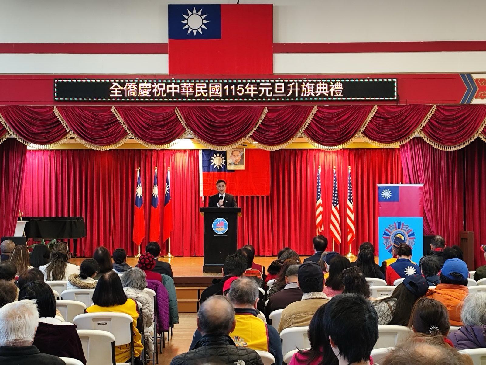 林處長致詞時特別感謝榮光聯誼會規劃舉辦中華民國元旦升旗典禮,並肯定參加升旗典禮的民眾將對臺灣的掛念,用最莊嚴的方式表達出來,在美國不僅是為了自己的家庭,臺灣僑胞總是將臺灣人的形象、創意還有善意帶到美國的社區及主流會,將臺灣的良善與可靠呈現給美國友人,這些都是為臺灣加分,2025年台灣走得不輕鬆,但是臺灣沒有停下來,而且越走越穩。