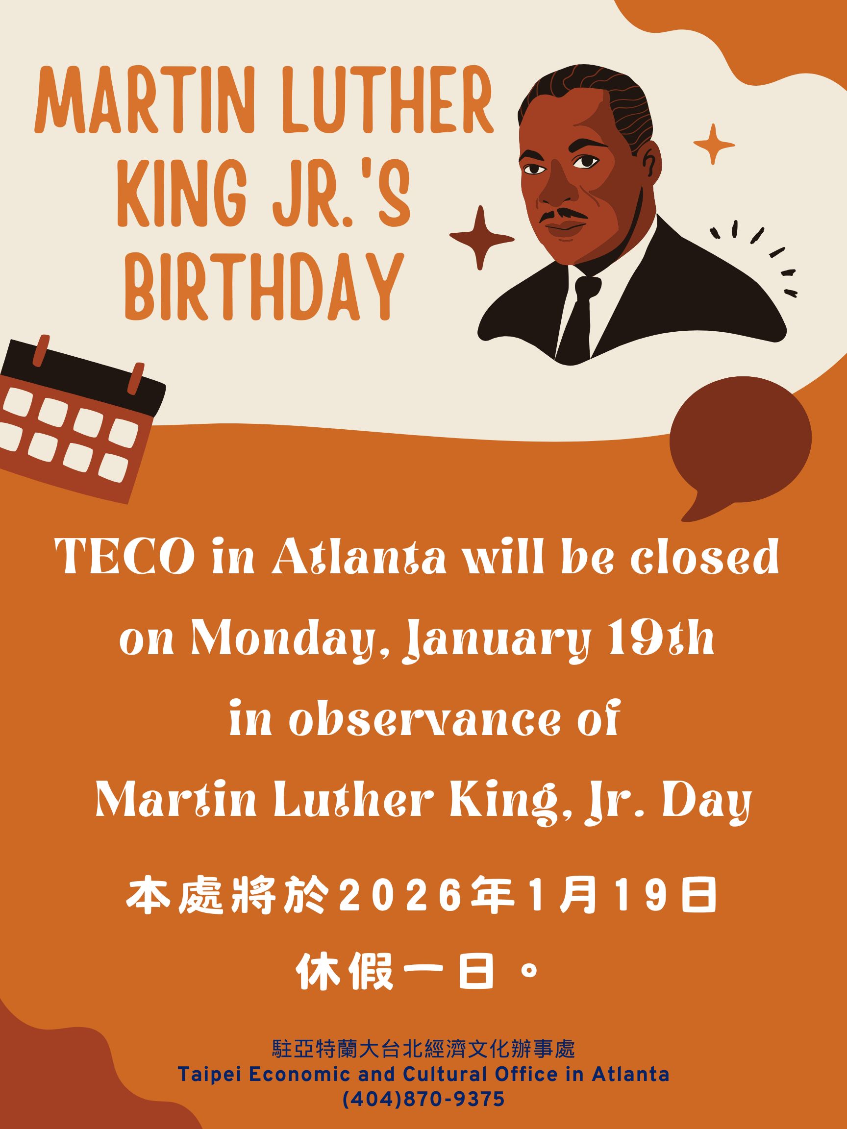 駐亞特蘭大台北經濟文化辦事處配合金恩博士誕辰紀念日,將於2026年1月19日(星期四)暫停對外服務一日。 倘於前述假日遇有重大急難事件需緊急協助,請撥打本處緊急聯絡電話: 404-358-3875。