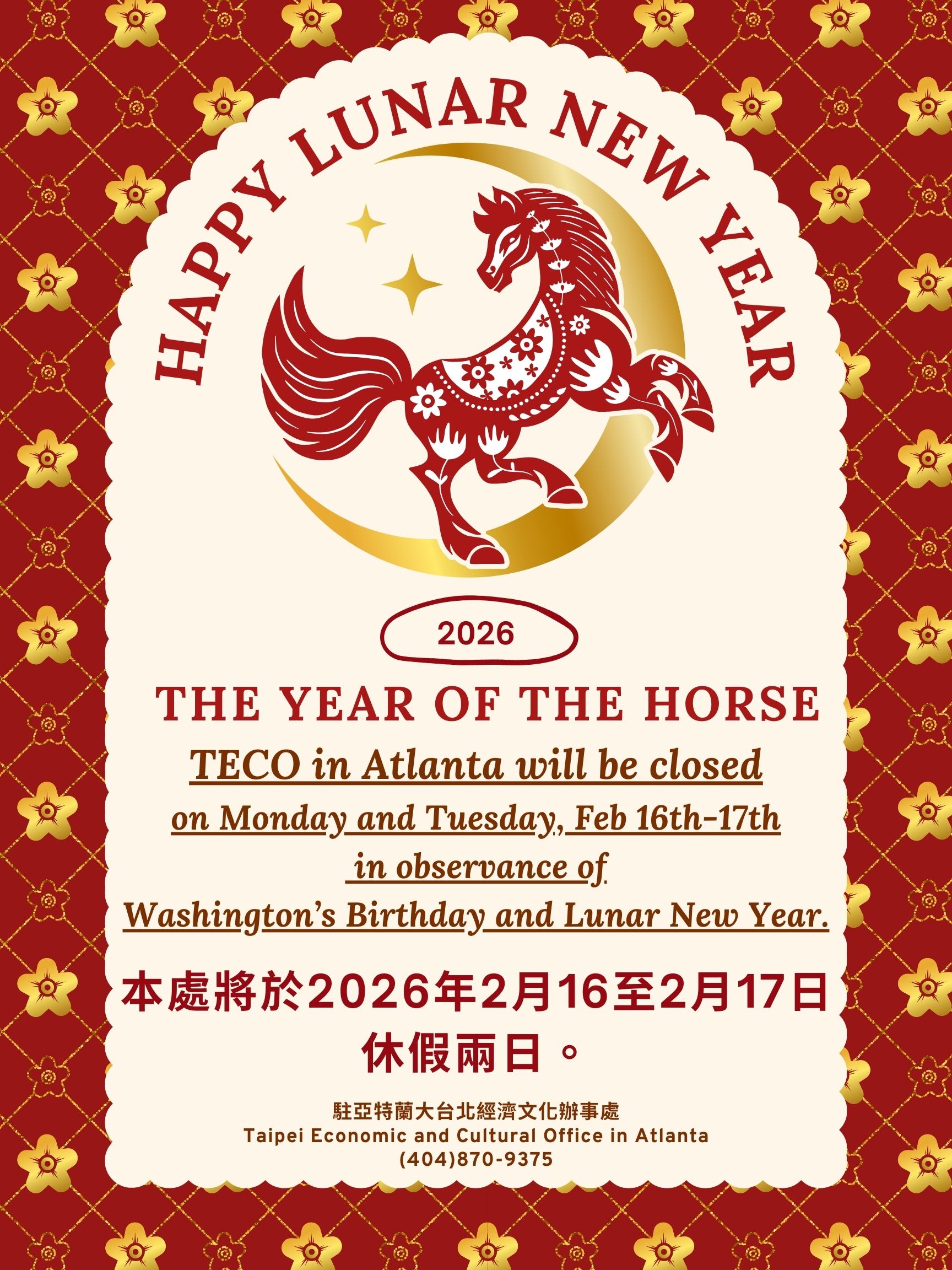 駐亞特蘭大台北經濟文化辦事處配合華盛頓總統誕辰紀念日及農曆春節,將於2026年2月16日至2月17日(星期一至星期二)暫停對外服務兩日。 倘於前述假日遇有重大急難事件需緊急協助,請撥打本處緊急聯絡電話: 404-358-3875。