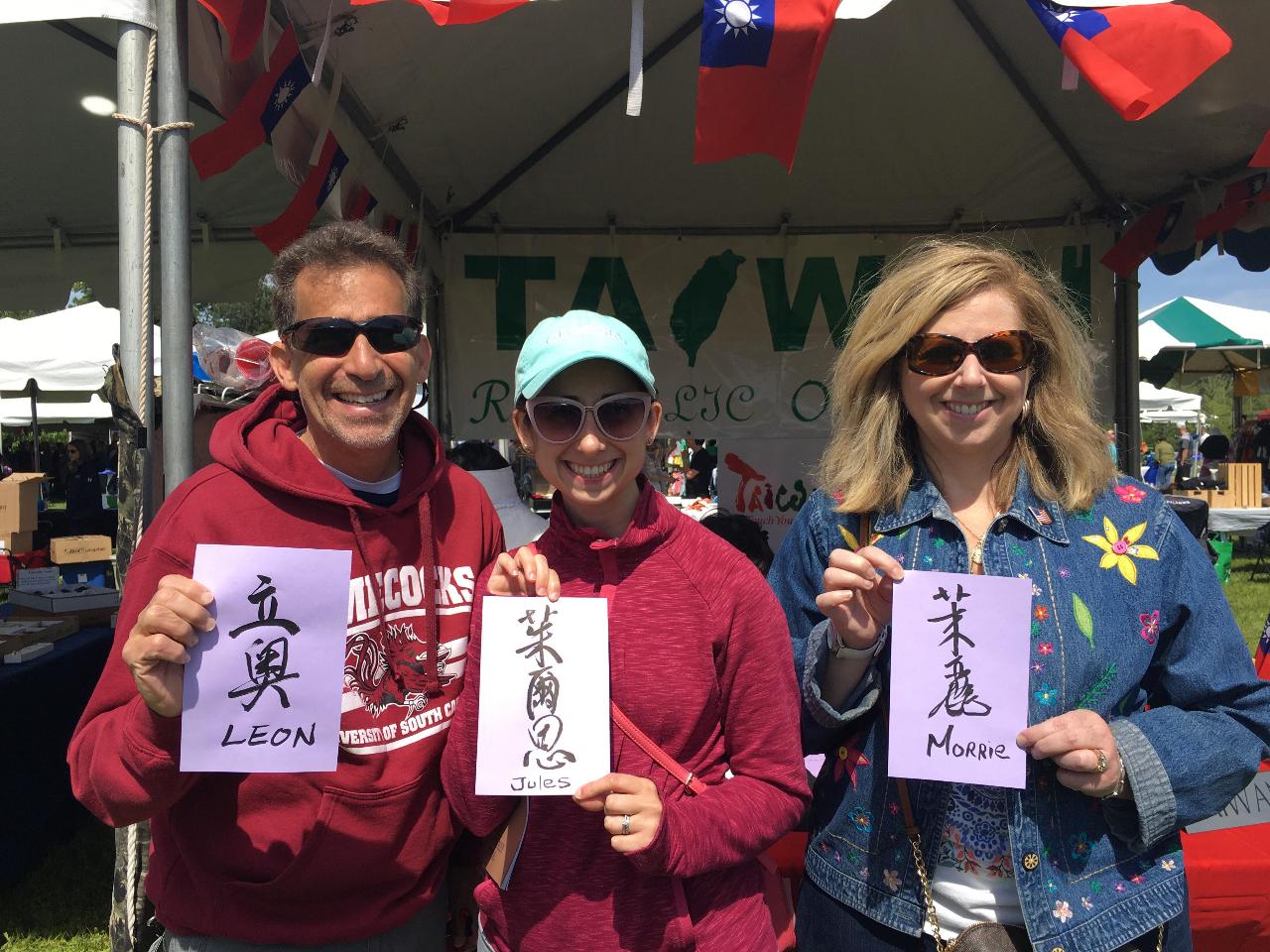 7 照片四:美國民眾與中文姓名書法作品在經文處攤位前合影。
