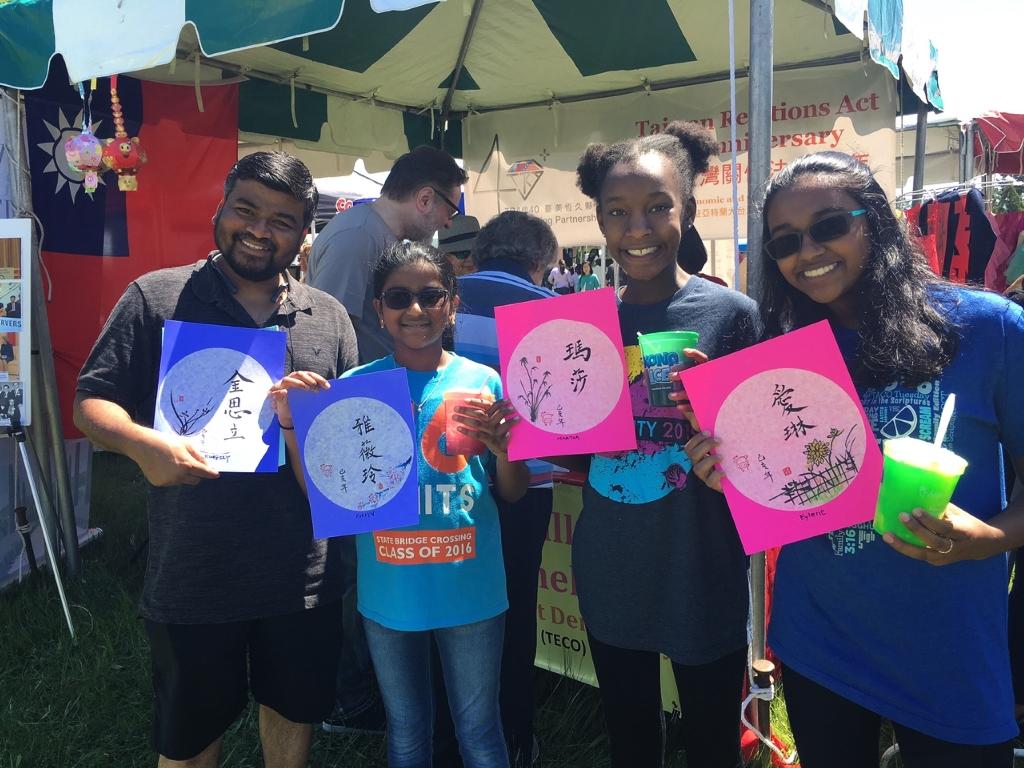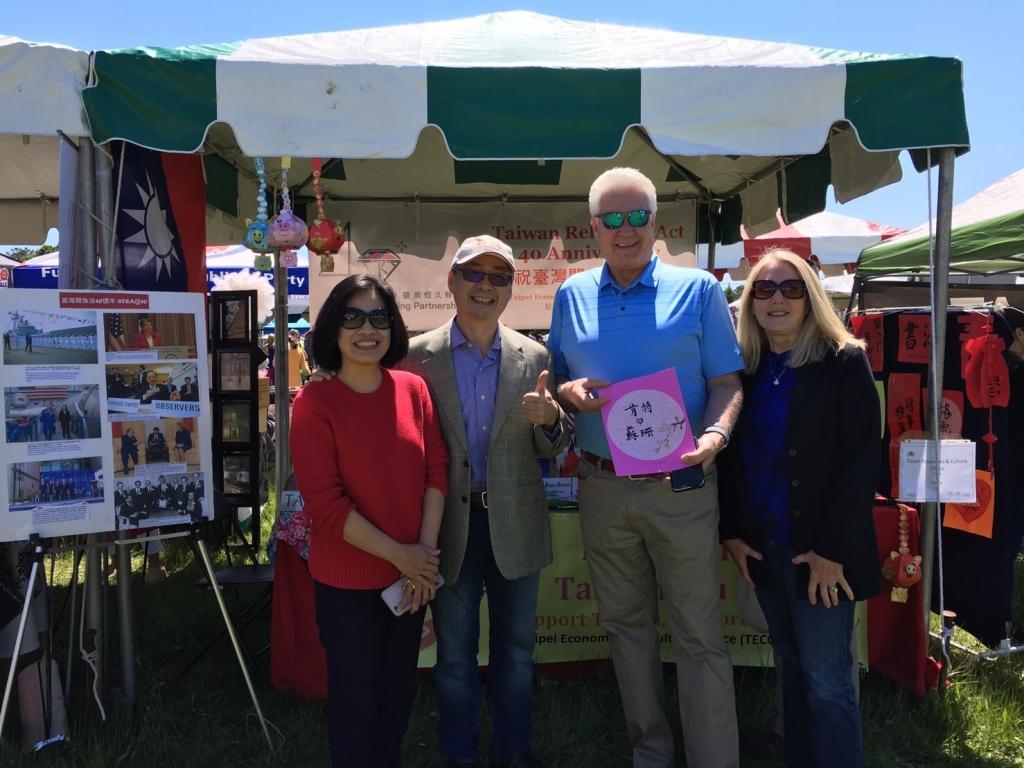 經文處攤位以宣介「慶祝臺灣關係法40週年」及支持我參與WHA (Health for all, Taiwan can help)為主軸,現場展出多幅TRA @40珍貴歷史照片,吸引民眾駐足觀看;今年並安排邱慧珠、陳真玢2位書法老師揮毫,為民眾翻譯及書寫中文姓名,參觀人潮絡繹不斷,廣受好評。