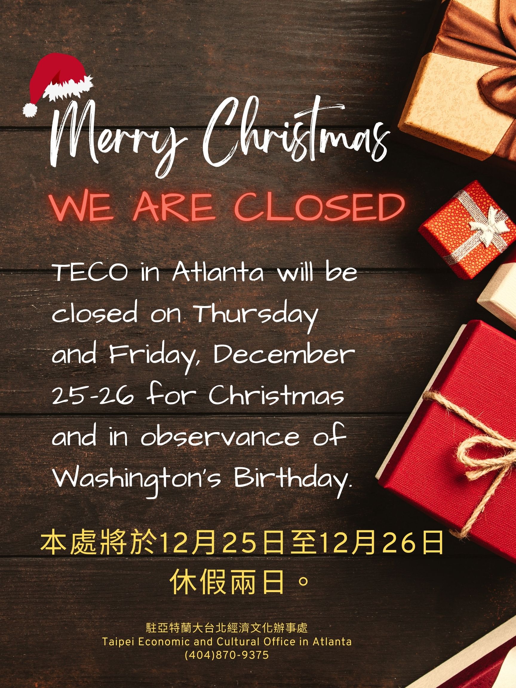 The Taipei Economic and Cultural Office (TECO) in Atlanta will be closed on Thursday and Friday, December 25th to 26th, 2025 for Christmas Day.