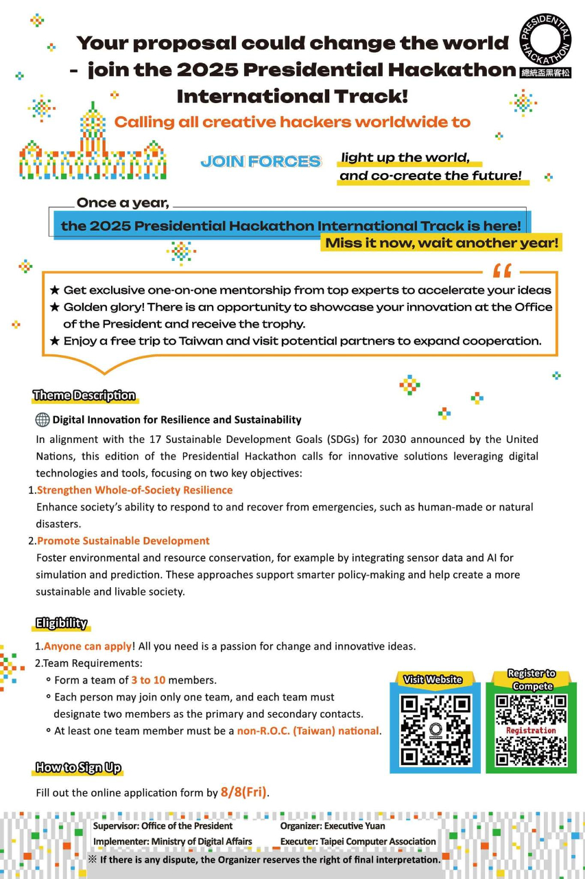 2025總統盃黑客國際松 提案熱烈募集中! - 駐波士頓台北經濟文化辦事處 Taipei Economic and Cultural Office in Boston ::: 跳到主要內容區塊