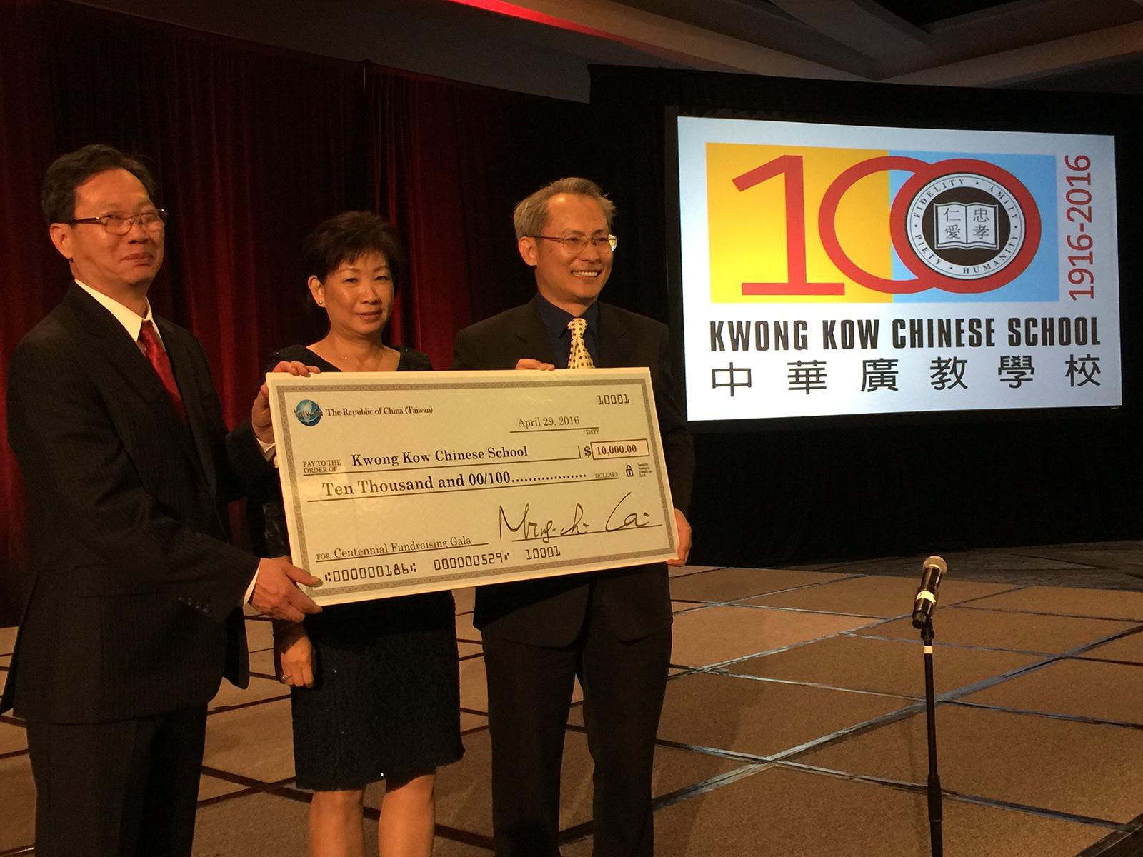 賴處長代表僑委會及外交部捐贈一萬美元給該校並頒陳委員長賀詞及「功宏僑教」匾額一幅予該校,期勉該校學務蒸蒸日上。