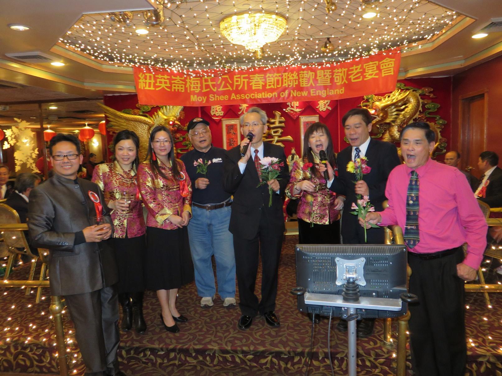 紐英崙梅氏公所於2月4日晚間在在華埠龍鳳大酒樓舉辦春節敬老餐會,席開40桌,400餘人參加,並安排卡拉ok助興及摸彩活動,熱鬧溫馨。駐波士頓臺北經濟文化辦事處處長賴銘琪伉儷、副處長陳銘俊、僑教中心主任歐宏偉、本地華埠及芝加哥、紐約等外州許多僑團負責人等貴賓均出席致意,向該公所耆老宗親賀歲拜年,並祝賀在主席梅少彬及梅麗梨領導下,會務蒸蒸日上。 賴銘琪也特別感謝梅氏公所對於中華民國政府的支持,期盼未來多參與僑社及雙十國慶等各項愛國活動;歐宏偉也轉達僑務委員會委員長吳新興對於海外僑胞鄉親的問候與祝福。