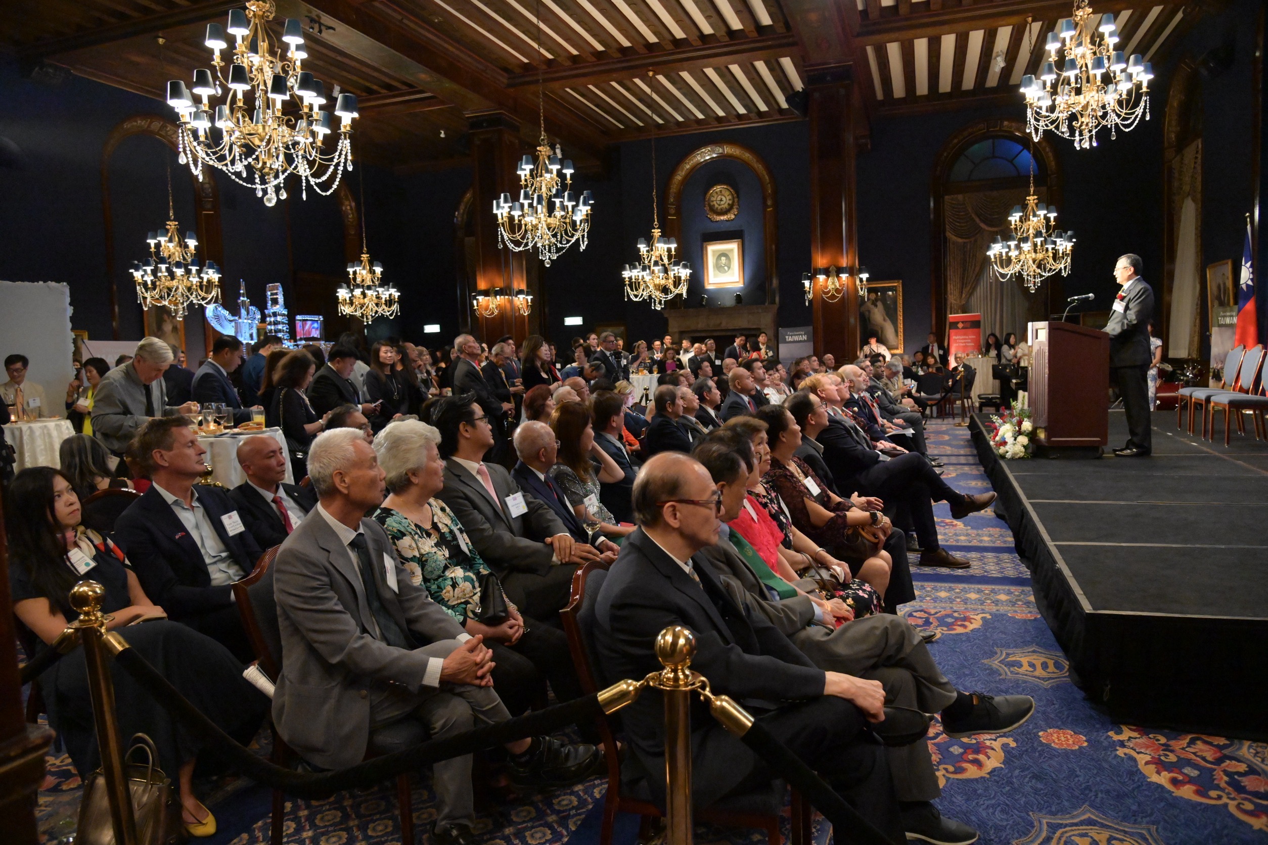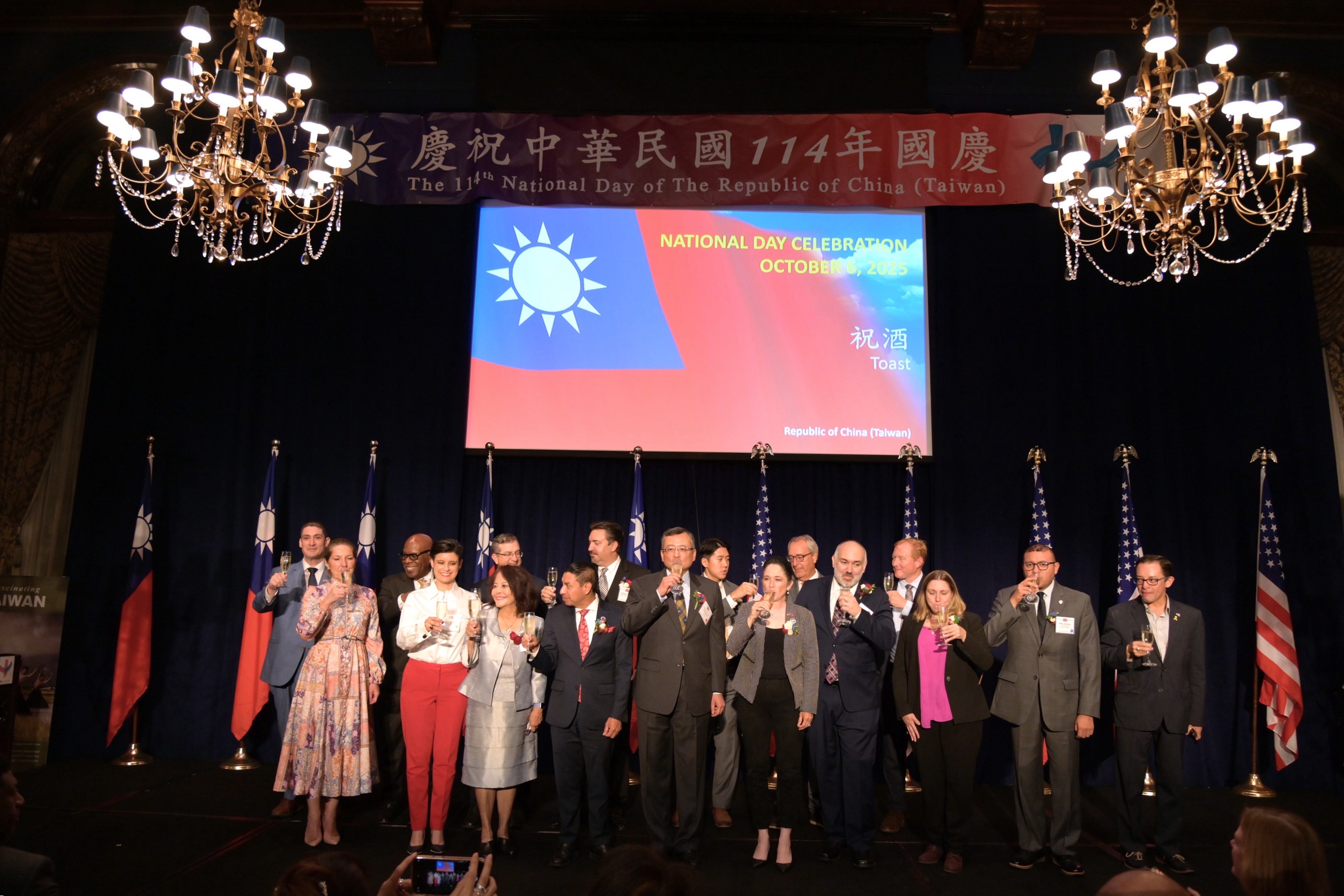 駐芝加哥臺北經濟文化辦事處於本(10)月6日晚間在歷史悠久的芝加哥合眾俱樂部舉辦中華民國114年國慶酒會。伊利諾州審計長Susana Mendoza、印第安納州州務卿Diego Morales、威斯康辛州財長John Leiber、伊州經發廳長Kristin Richards、伊州經發會會長Christy George、印州州議會「友台連線」共同主席Mike Andrade眾議員、芝加哥市議會「友台連線」共同主席 Raymond Lopez、Scott Waguespack、伊州州參議員Laura Ellman與Richard Ventura及密西根州參議員Roger Victory,瓜地馬拉、海地、比利時及哥斯大黎加等各國駐芝加哥總領事館總領事及資深館員等,近400位政商僑學界貴賓齊聚祝賀我國114年國慶。其中伊利諾州審計長Susana Mendoza 及近30名美方政要出席,政要雲集,僑界亦展現團結,允為此間主流政界、僑界及領事團難得盛會。
