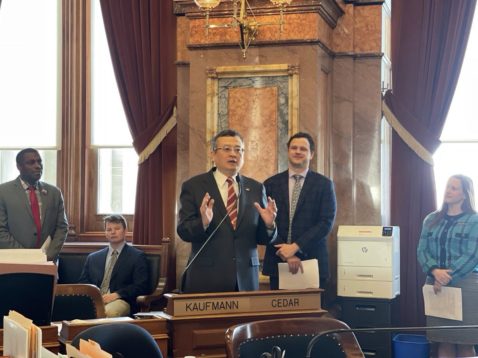 圖一、二:駐芝加哥辦事處類總領事延峰赴愛荷華州參、眾議院見證友台決議案獲無異議通過,並接受現場議員歡迎。