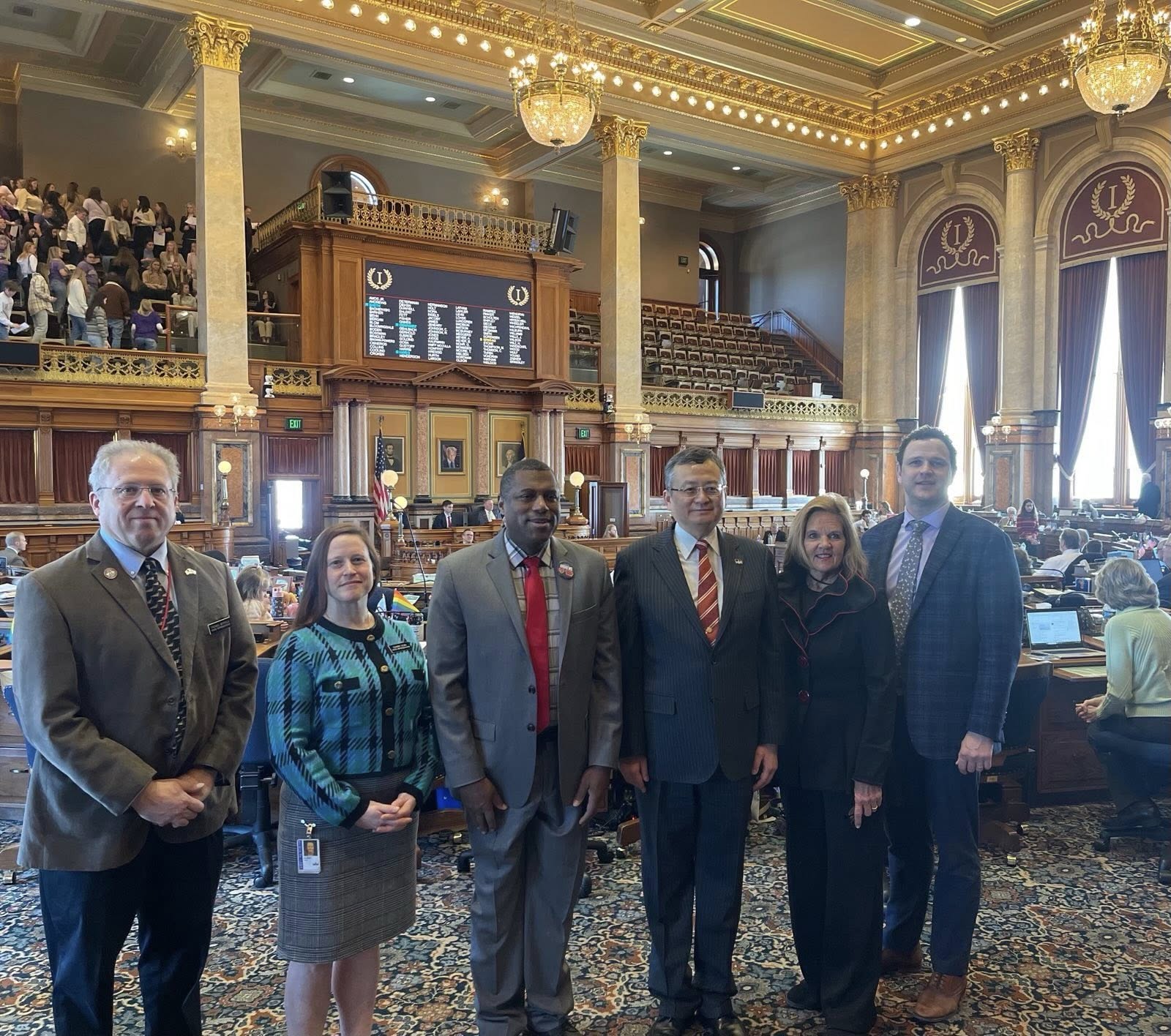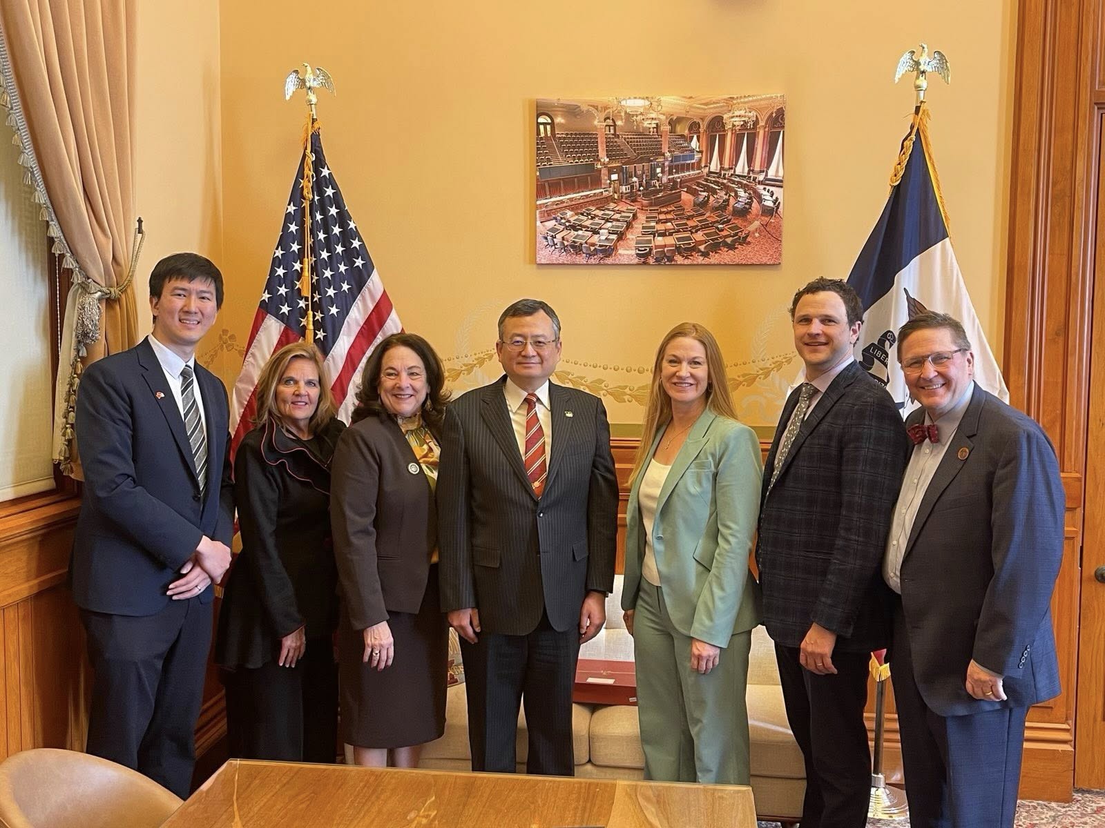 駐芝加哥辦事處類總領事延峰也獲參、眾兩院議員熱烈歡迎,並獲邀至議會會場演說,類總領事感謝愛州議會夥伴的長年友誼及以行動力挺台灣,同時表示愛州是全美第一大玉米生產州、第二大黃豆生產州、第一大雞蛋生產州、第一大豬肉生產州及第一大生質能源生產州等,台愛州農業合作持續成長,我國農訪團多次訪愛州,我國廠商亦將於未來四年對美採購100億美元之黃豆、玉米、小麥及牛肉,強化糧食供應鏈安全及幫助愛州在內的美國農民降低國際貿易擾動到衝擊,此外,從2024年雙方簽署經貿MoU到2025年底在台設處,均彰顯雙方夥伴關係日益密切。