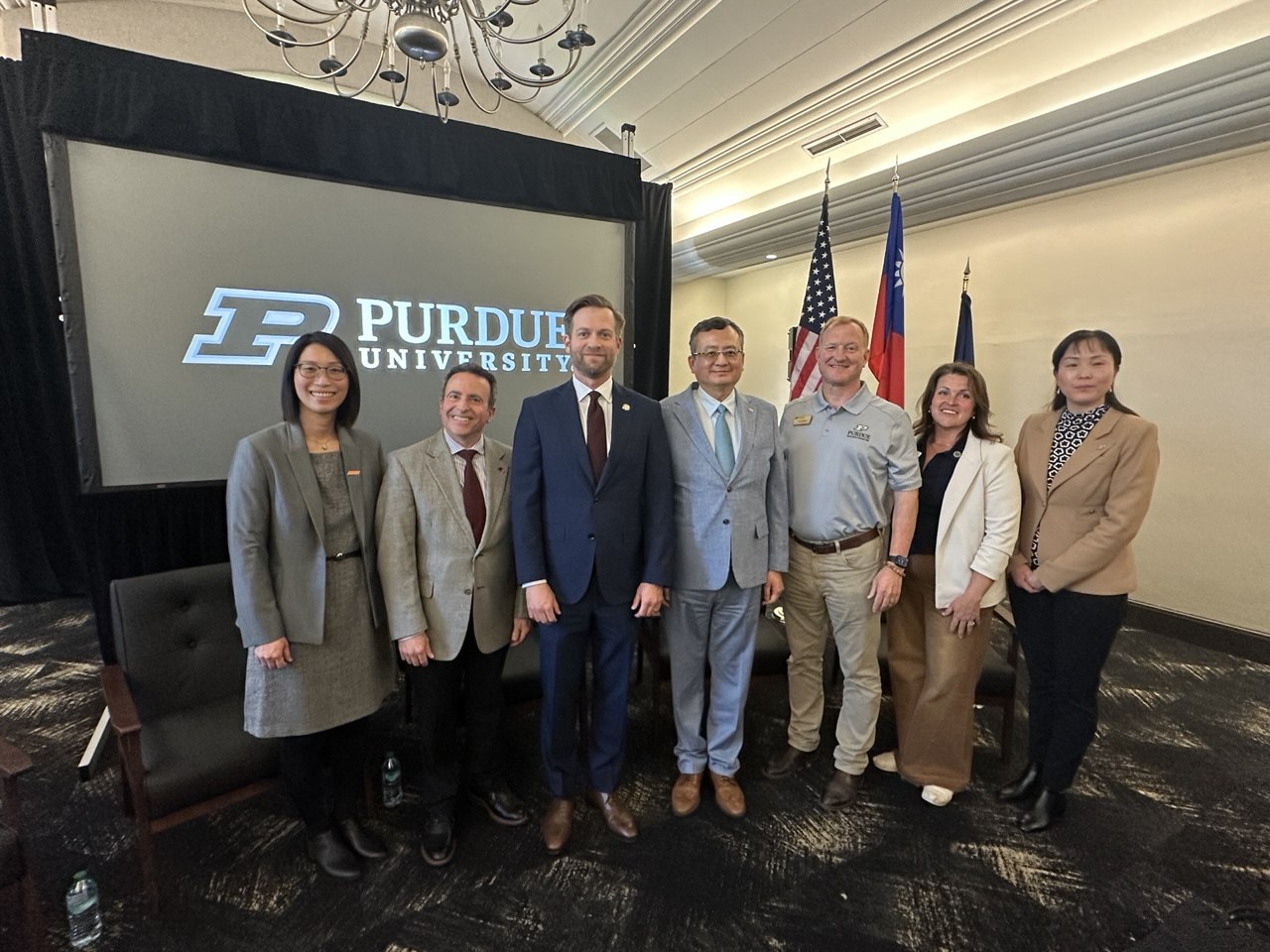 類處長與印州經發廳總裁Josh Richardson(左3)、聯發科美國研究科學家Debby Lin(左1)、普度研究基金會會長Chad Pittman(右3)、普度大學副校長Dan Delaurentis(左2)、半導體領導協會主席Zhihong Chen(右1)及印州檢察總長代表(右2)合影。