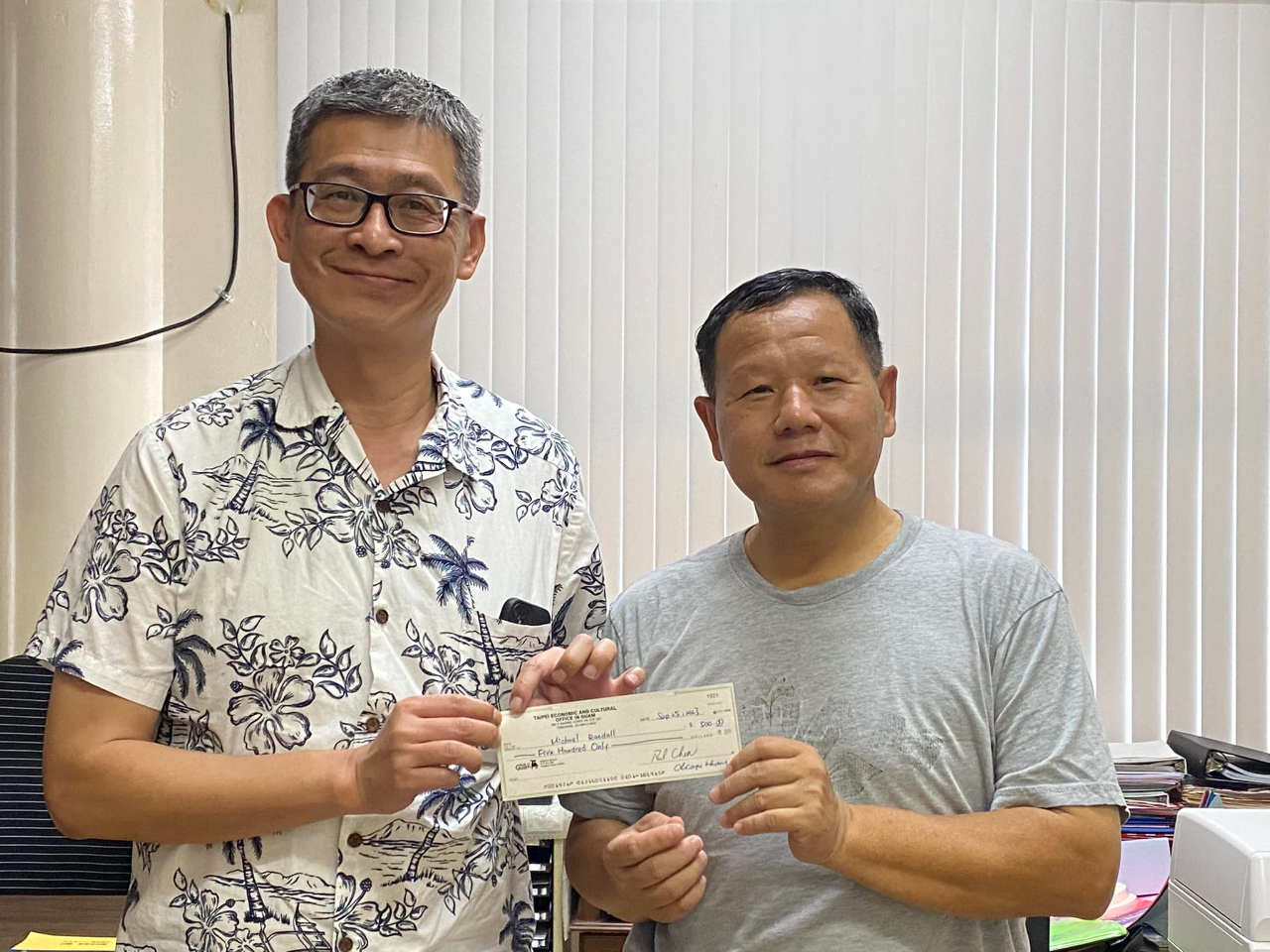 盧副組長啟章於本(25)日代表陳總領事盈連將我政府所撥活動補助款支票轉交「關島榮光聯誼會」 - 駐關島台北經濟文化辦事處 Taipei Economic and Cultural Office in Guam ::: 跳到主要內容區塊