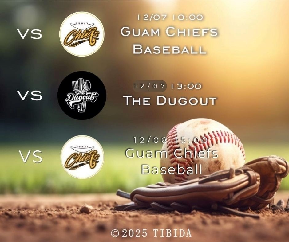 TEAM TAIWAN挺台灣 社團法人台灣國際棒球交流發展協會訂於2025年12月6日至10日訪問關島進行「2025關島-臺灣棒球交流賽」,將與關島Sumay Chiefs及The Dugout兩支棒球隊在Harmon Complex Baseball Field進行交流賽,不收門票,敬邀僑胞與熱愛棒球的朋友觀賽,為台灣隊加油。 賽事時間 12月7日(星期日) 上午10點:台灣隊 VS Sumay Chiefs隊。 12月7日(星期日) 下午1點:台灣隊 VS The Dugout隊。 12月8日(星期一) 下午3點:台灣隊 VS Sumay Chiefs隊。