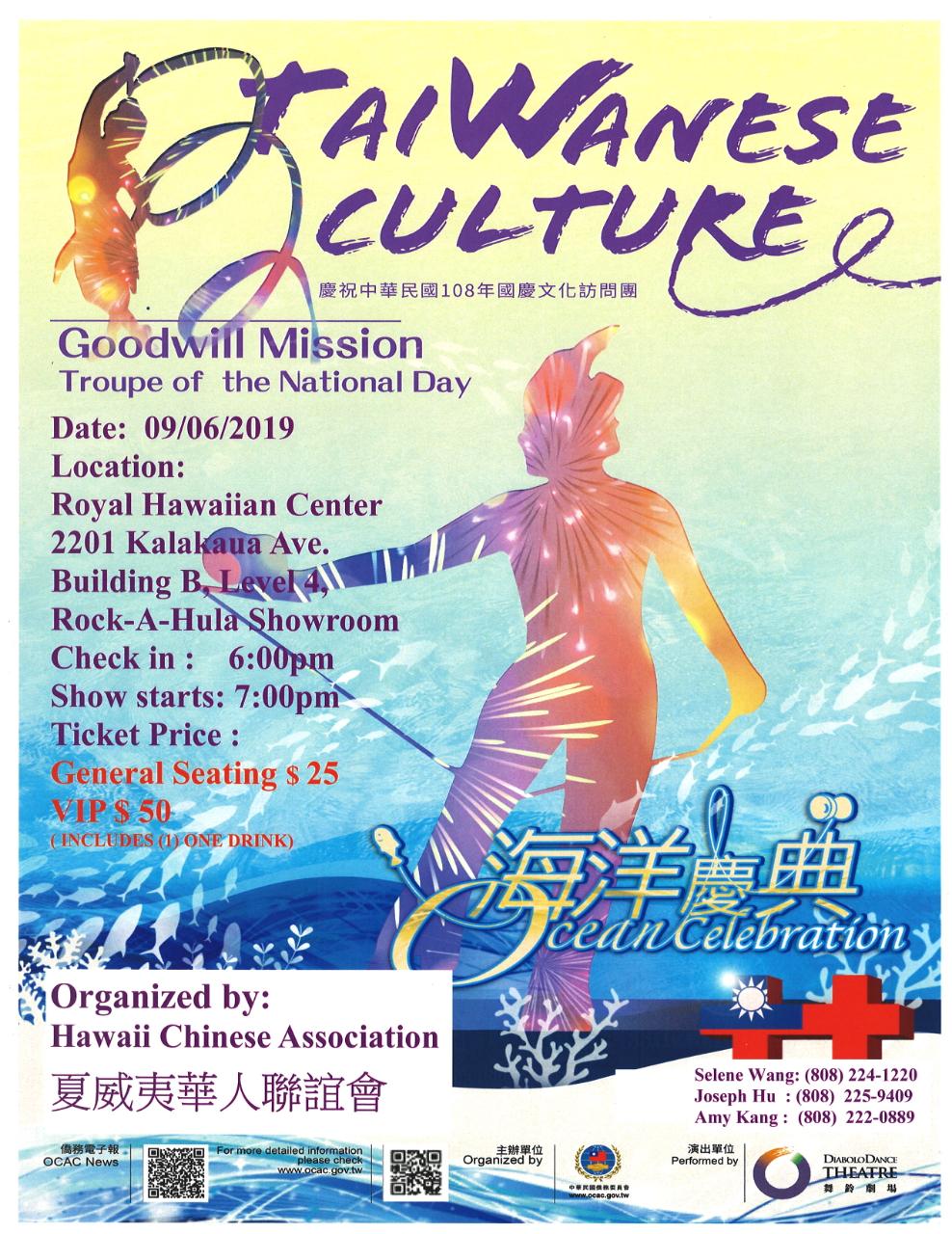 僑務委員會為支援海外僑社辦理雙十國慶活動,促進僑界與當地主流文化藝術交流,本(108)年特委由「舞鈴劇場」籌組國慶文化訪問團於美洲地區巡迴訪演;該團首站於9月6日在檀香山「皇家夏威夷中心」(Royal Hawaiian Center)演出。
