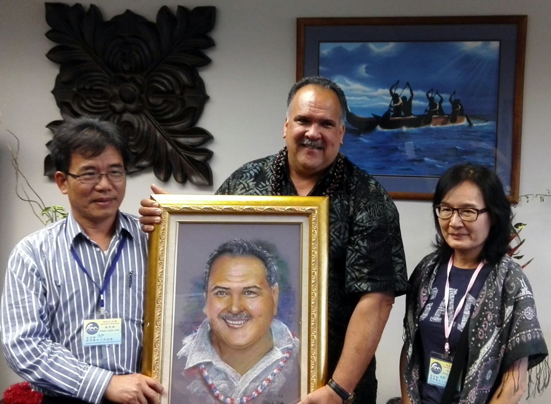 澎湖縣國際藝術交流協會鄭理事長美珠一行於本(104)年3月9日由夏威夷台灣人中心呂會長華蕙、夏威夷中華文化服務中心沈戴會長佩芳、考艾郡華人聯誼會蔡副會長淑麗及駐檀香山辦事處黃副組長建財陪同赴考艾郡拜會郡長Bernard Carvalho,送交澎湖縣陳縣長光復親筆函,轉達問候摯意及加強雙方交流互動之決心,並致贈由團員親繪之C郡長肖像畫誌念,C郡長欣喜歡歌一曲迎賓並回贈禮品及設宴款待訪團乙行。