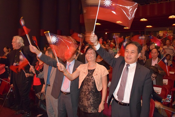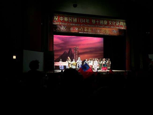 104年國慶文化訪問團於美國德州休士頓大學卡倫堂演出,黃敏境處長應邀上台致詞說明中華民國在國際間扮演中華文化領航者以及致力保存與發揚具台灣特色的中華文化。